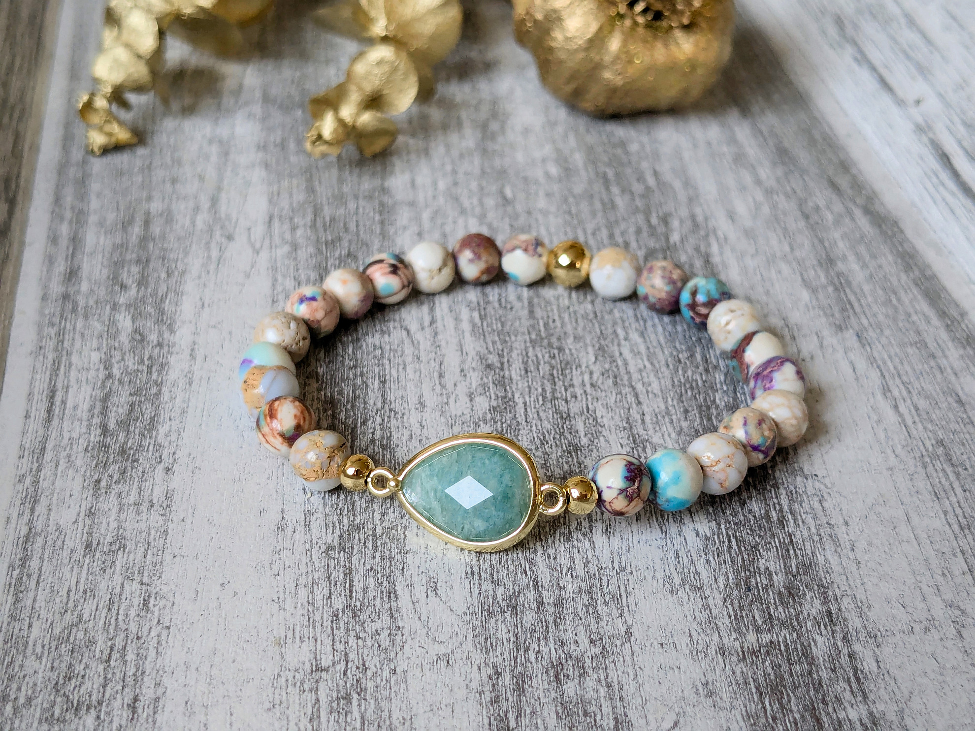 Náramok bledý jaspis regalit a amazonit je vytvorený z 6mm korálok jaspisu, ktorý je doplnený o komponent z amazonitu a oceľové korálky. Náramok je na elastickom lanku a sedí na zápästie 15cm. Veľkosť je možné upraviť, stačí v objednávke do poznámky uviesť obvod zápästia natesno.