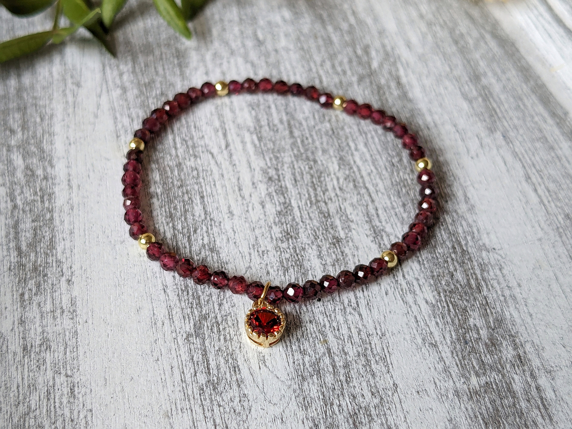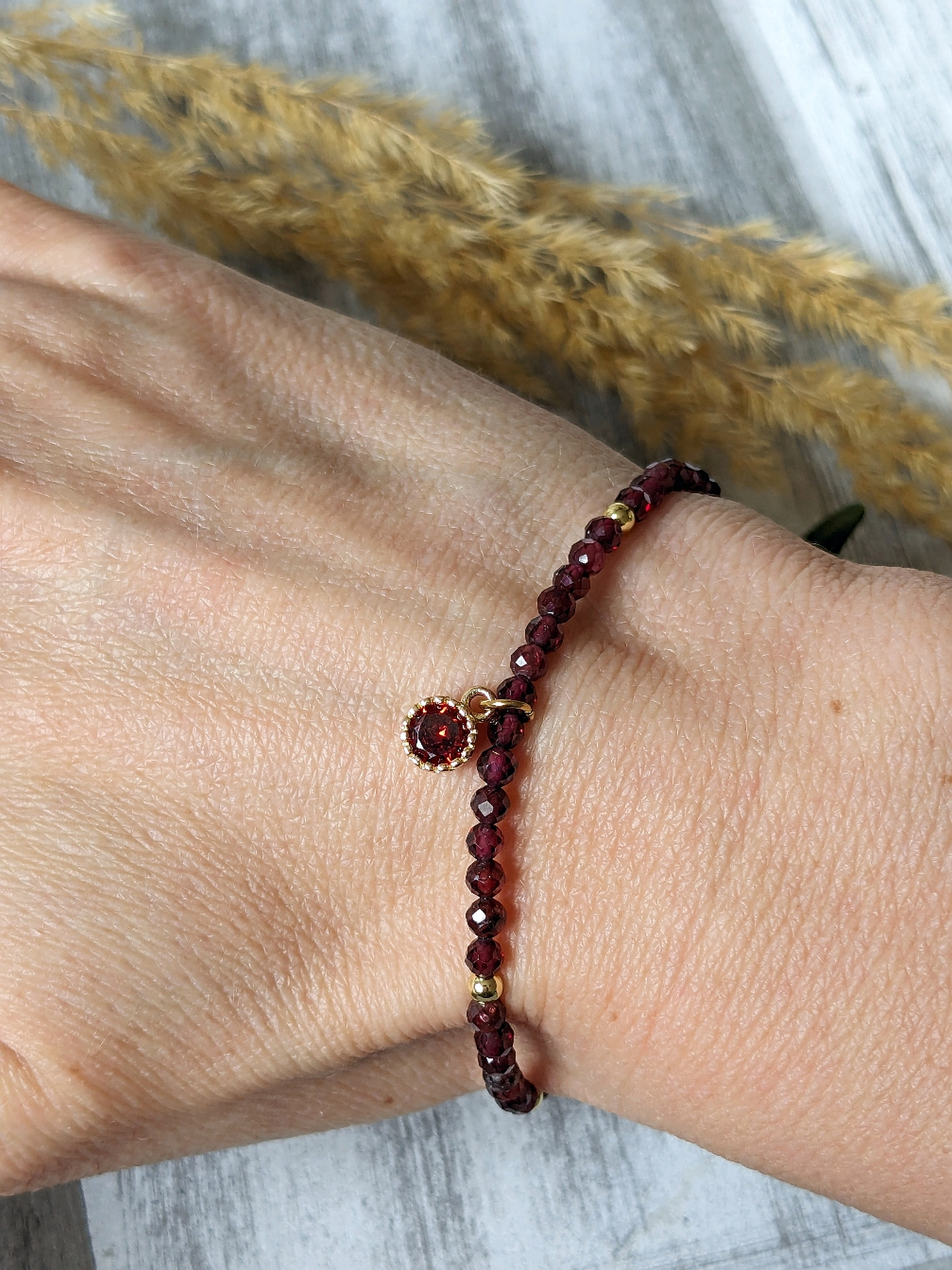 Granátový náramok so zirkónom je vytvorený z 3mm brúsených korálok granátu krásnej tmavočervenej farby. Granátové korálky dopĺňajú oceľové korálky v zlatej farbe a prívesok so zirkónom. Náramok je na elastickom lanku a sedí na obvod zápästia 15cm. Veľkosť je možné upraviť. Stačí v objednávke do poznámky uviesť obvod zápästia natesno.