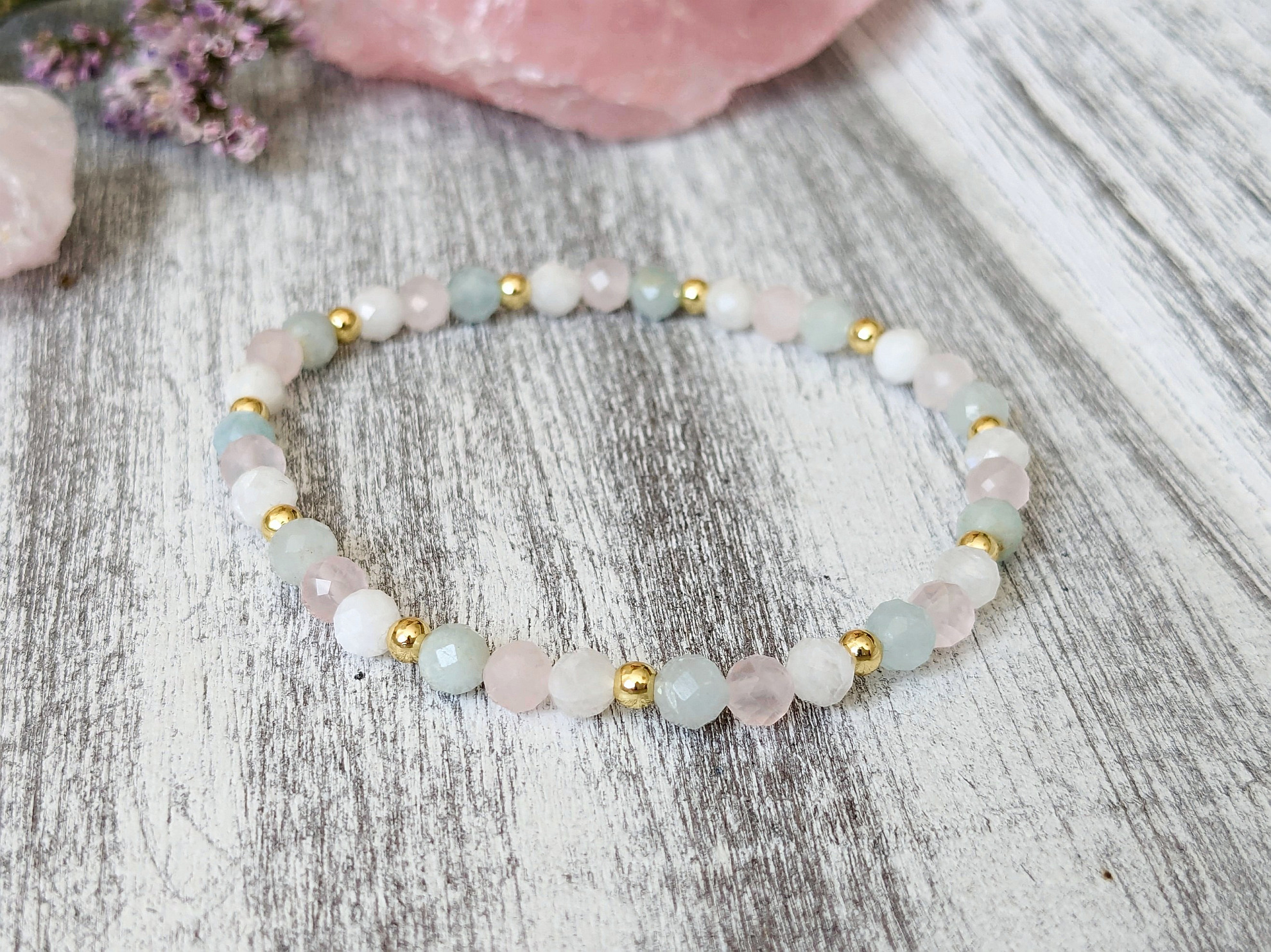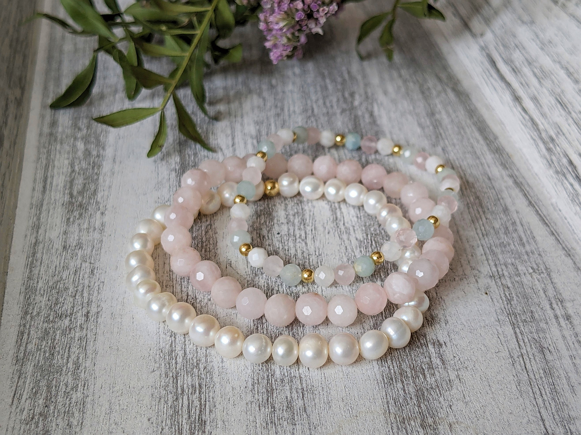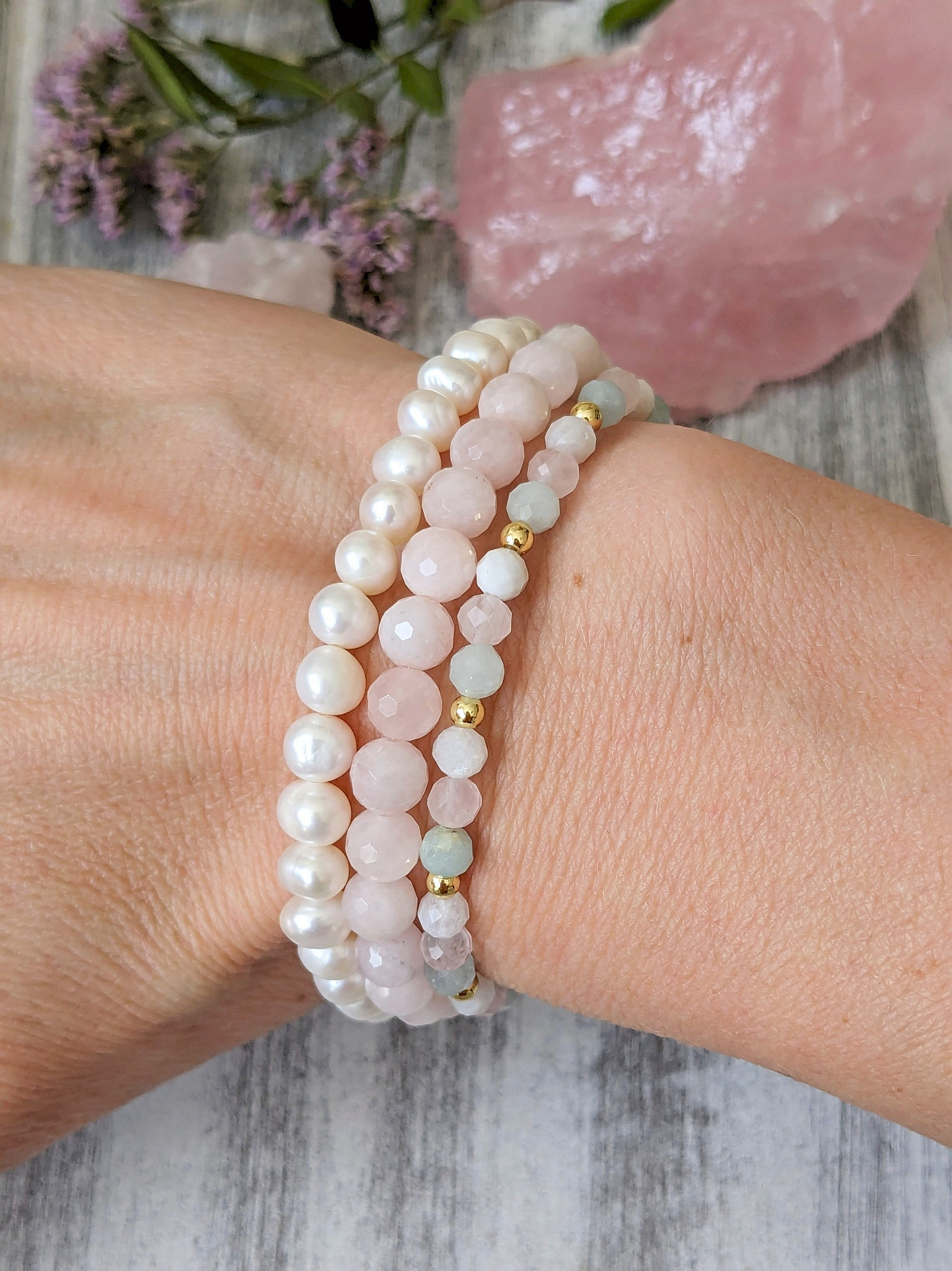 Jemný set mix minerálov tvoria tri náramky z minerálov: ruženín, riečne perly, mesačný kameň a akvamarín. Komponenty v sete sú z ocele v zlatej farbe. Náramky sú na elastickom lanku a sedia na obvod zápästia 15cm. Veľkosť je možné upraviť, stačí v objednávke do poznámky uviesť obvod zápästia natesno.