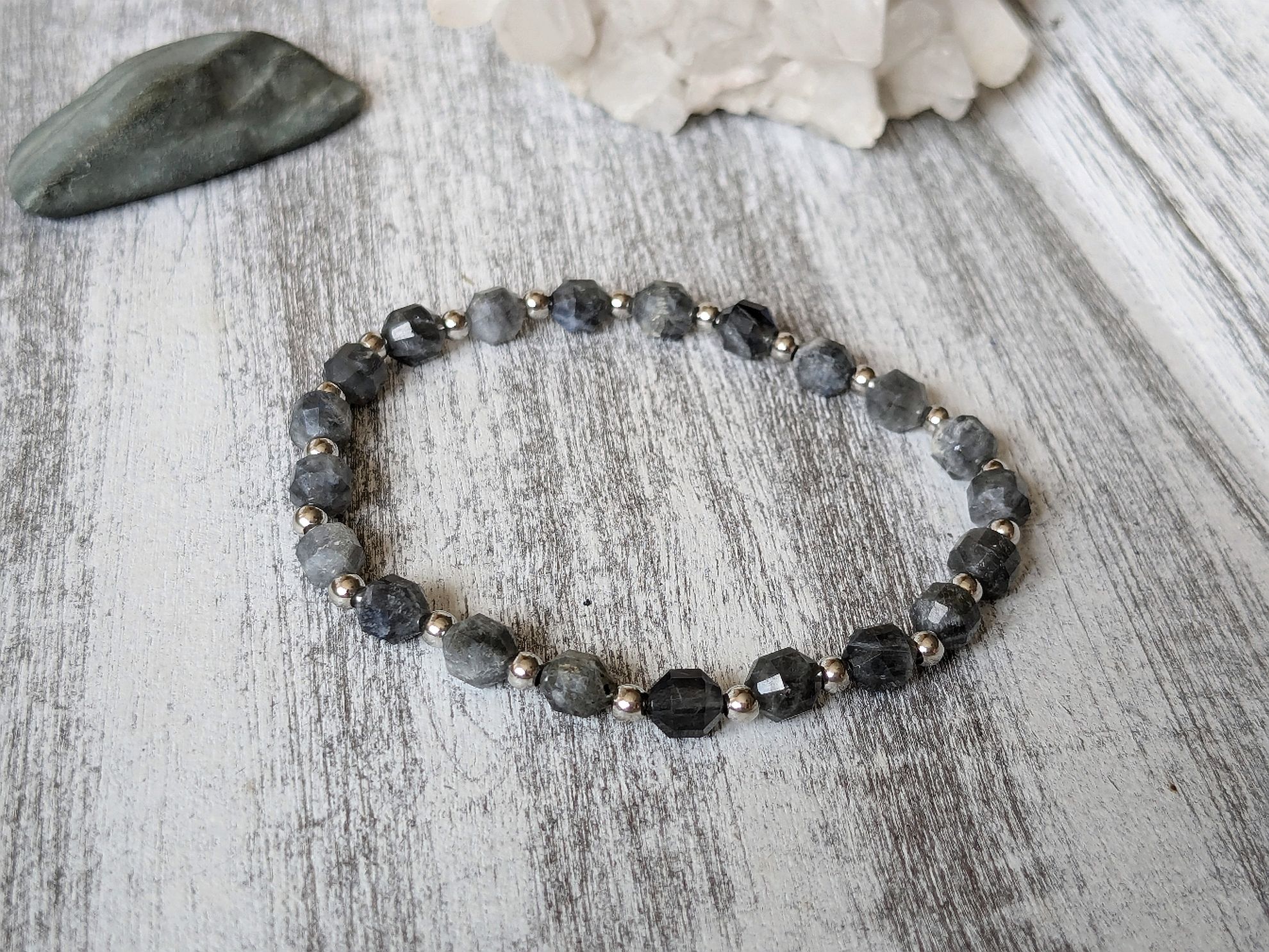 Labradoritový náramok je vytvorený z korálok labradoritu v tvare súdka a je doplnený o oceľové korálky. Náramok je na elastickom lanku a sedí na obvod zápästia 15cm. Veľkosť je možné upraviť, stačí do poznámky v objednávke uviesť obvod zápästia natesno.