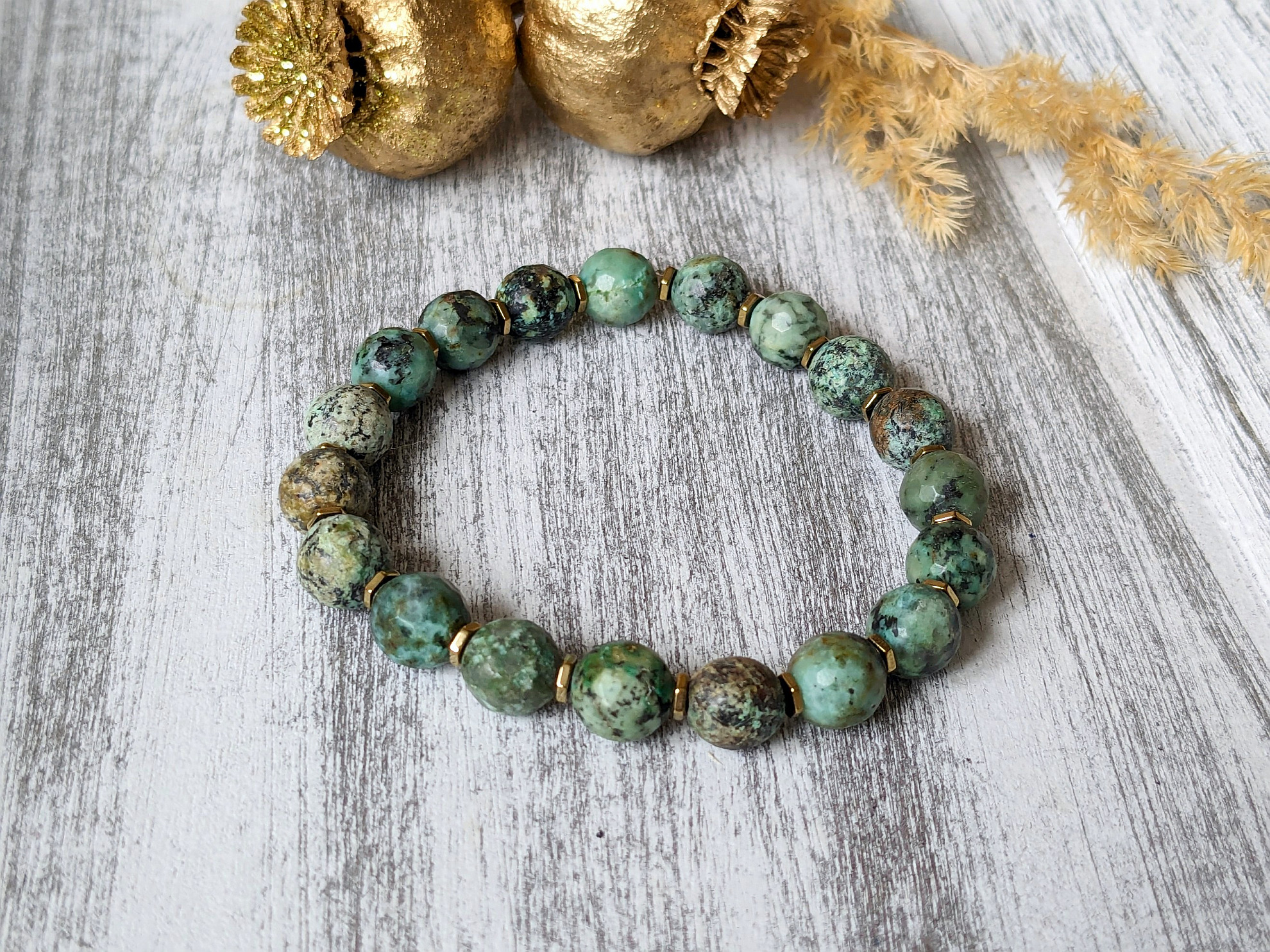 Náramok africký tyrkys a hematit je vyrobený z korálok jemnučko brúseného (málo viditeľné) afrického tyrkysu (8 mm). Korálky sú doplnené o komponenty zo syntetického hematitu v zlatej farbe. Náramok je na elastickom lanku a je vhodný na zápästie 15 cm. V prípade potreby je možné veľkosť upraviť, stačí v objednávke do poznámky uviesť obvod zápästia natesno.