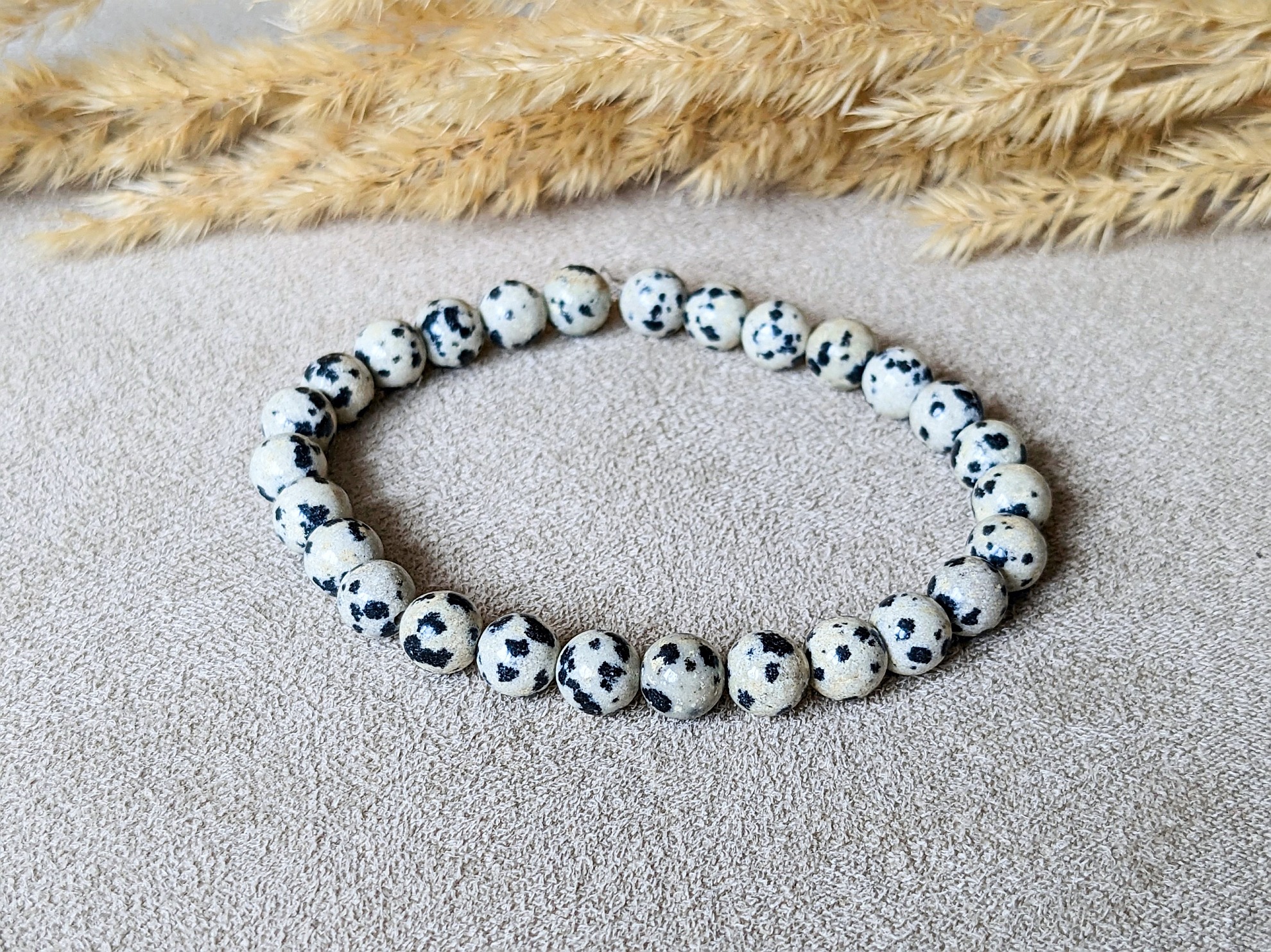 Náramok dalmatínsky jaspis je zaujímavý svojou kresbou, ktorá je typická pre dalmatínsky jaspis. Korálky majú veľkosť 6 mm. Náramok je na elastickom lanku a sedí na zápästia 15 cm. Je možné veľkosť upraviť, stačí v objednávke do poznámky uviesť obvod zápästia natesno.