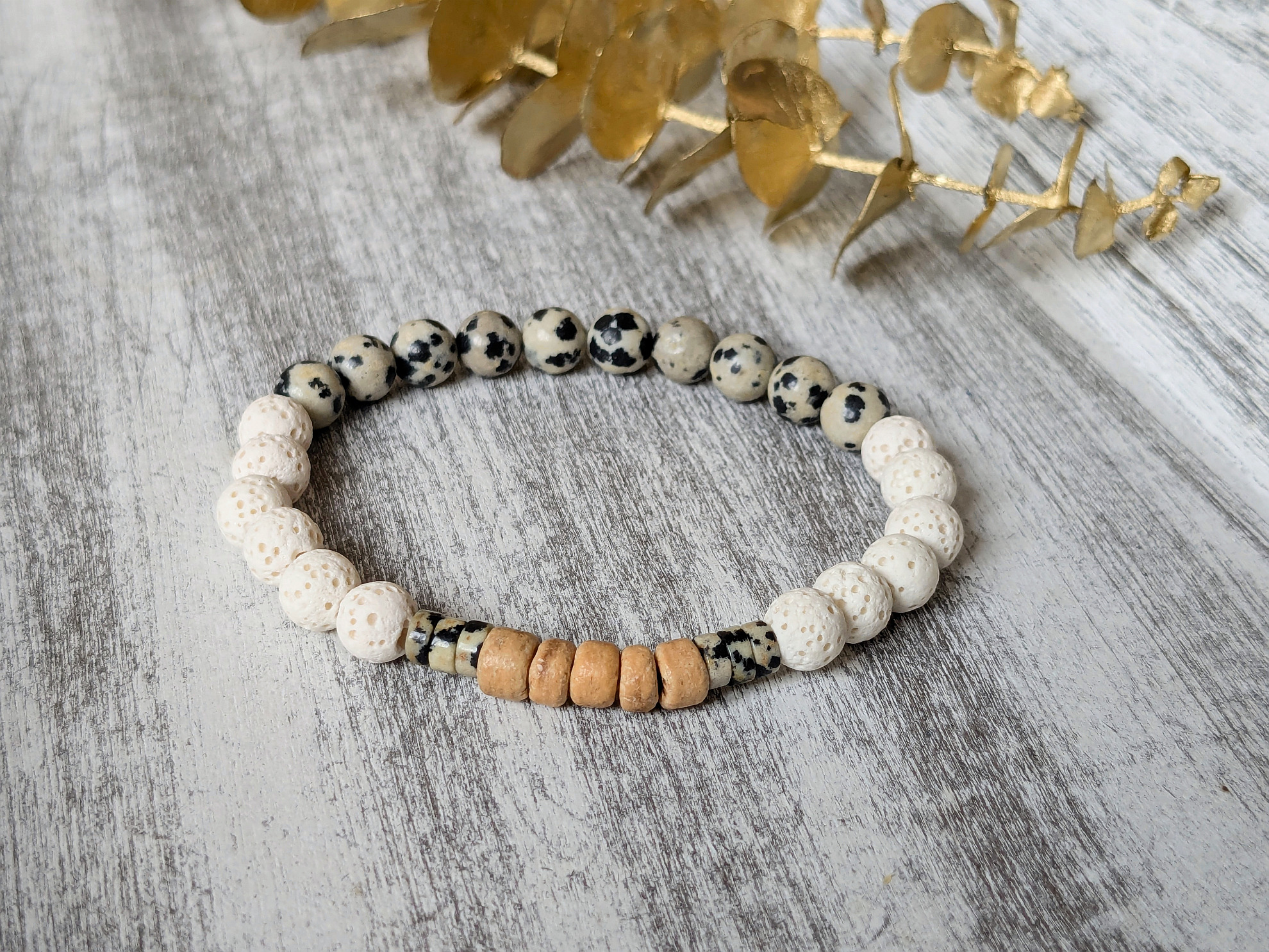 Náramok láva, drevo a jaspis je zaujímavý náramok z prírodných korálok bez komponentov. Biela láva je doplnená o korálky dalmatínskeho jaspisu a kokosového dreva. Náramok je na elastickom lanku a sedí na obvod zápästia 15cm. Veľkosť je možné upraviť, stačí do poznámky v objednávke uviesť obvod zápästia zmeraný natesno.