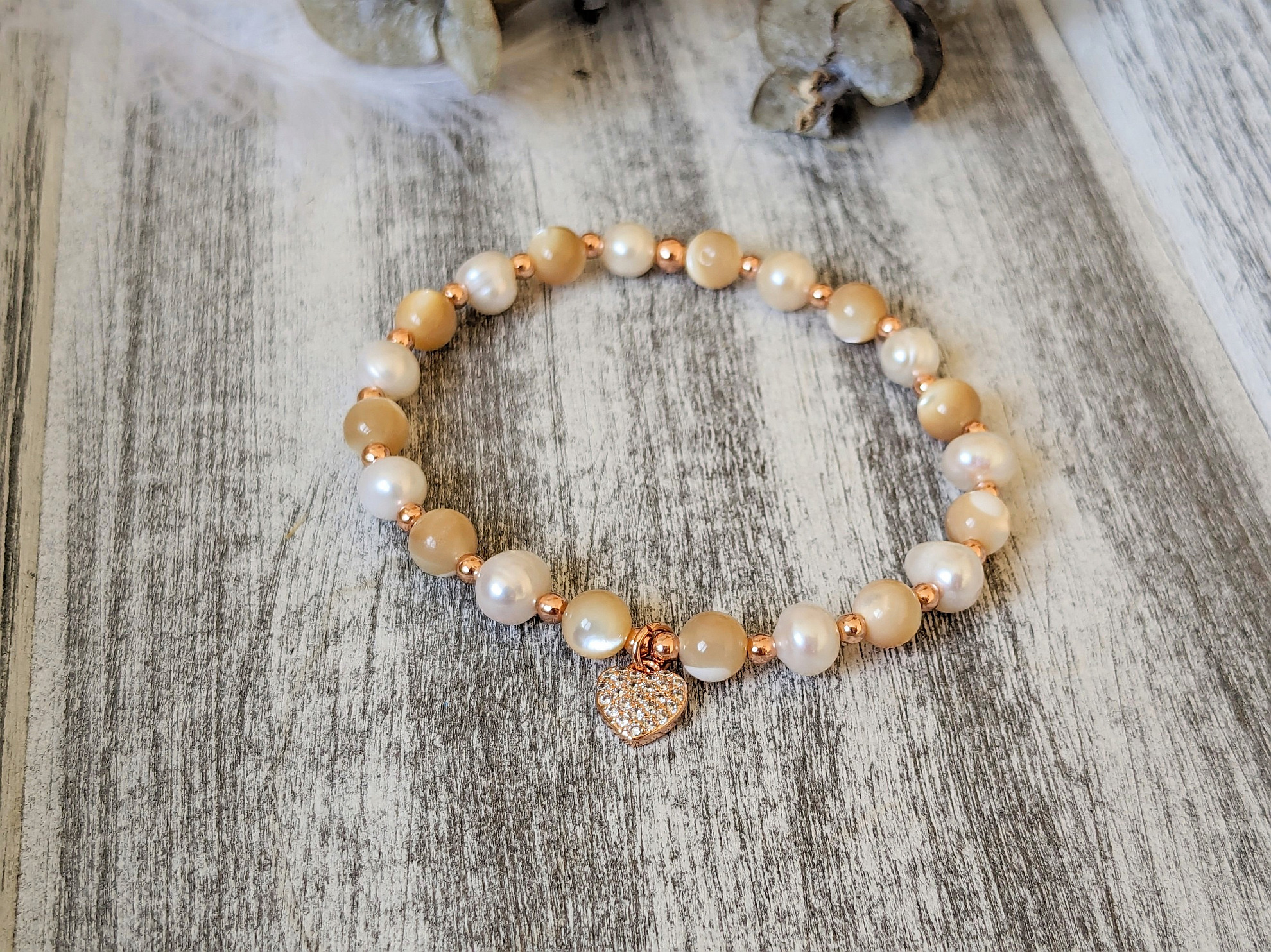 Náramok perla a perleť je elegantný náramok z riečnych perál a perleťových korálok (béžová), ktoré sú doplnené o oceľové korálky vo farbe ružového zlata a prívesok so zirkónovým srdiečkom. Náramok je na elastickom lanku a sedí na zápästie s obvodom 16cm. Veľkosť náramku je možné upraviť, stačí v objednávke do poznámky uviesť obvod zápästia natesno.
