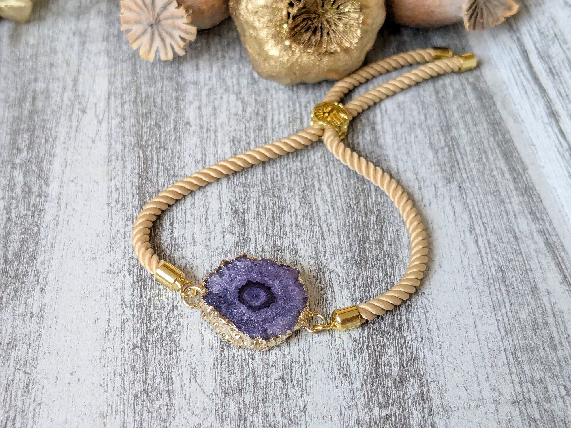 Náramok s fialovou drúzou je vyrobený z achátovej drúzy a je na nastaviteľnej šnúrke, ktorá sa prispôsobí zapästiu.
