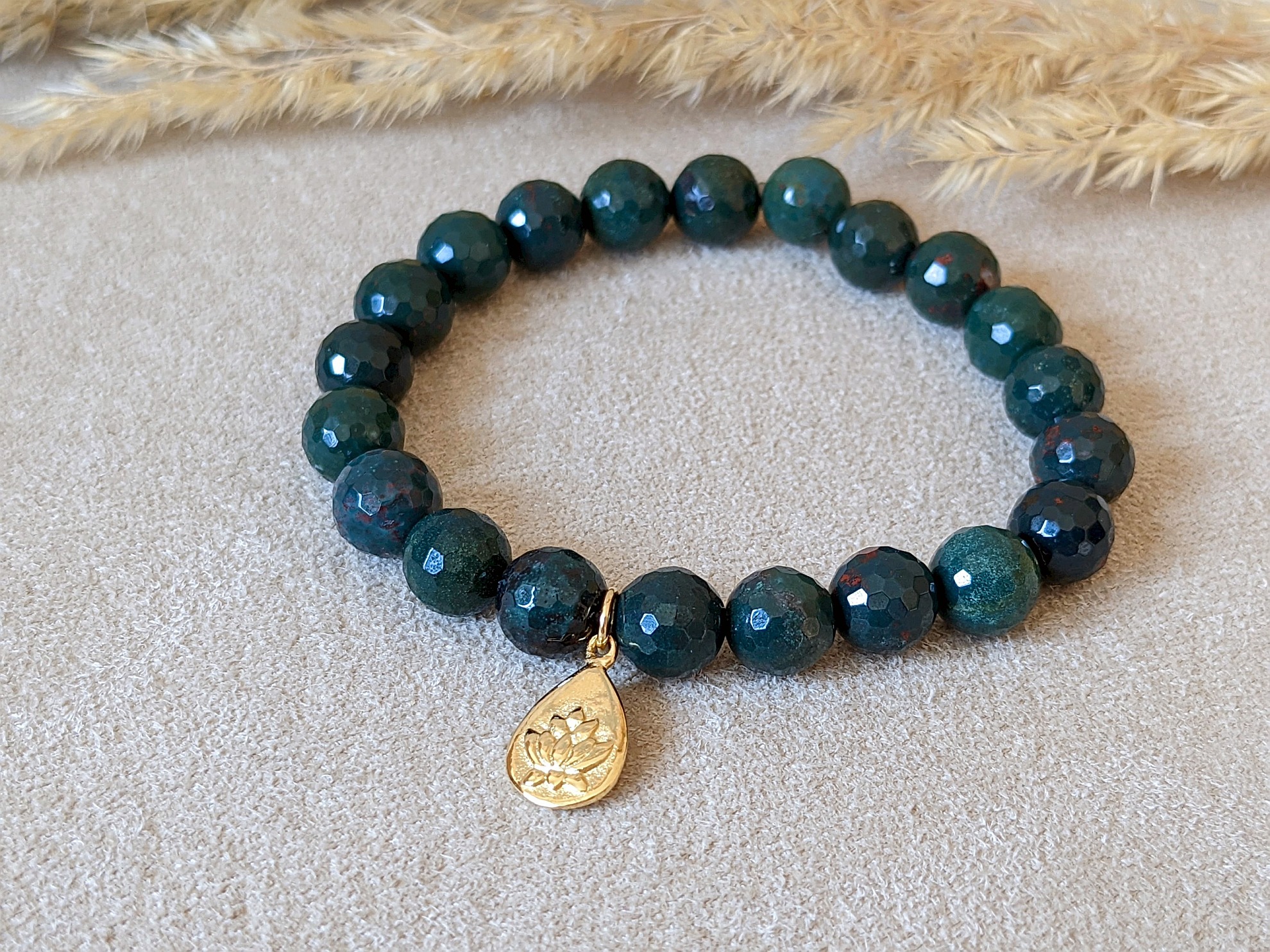 Náramok z indického achátu a heliotropu je vytvorený z krásnych tmavozelených brúsených korálok veľkosti 8 mm. Dopĺňa ho pozlátený prívesok s motívom lotosového kvetu. Náramok je na elastickom lanku, momentálne je jeho veľkosť prispôsobená na obvod zápästia 15 cm. Veľkosť je možné upraviť, stačí v objednávke do poznámky uviesť obvod zápästia natesno.