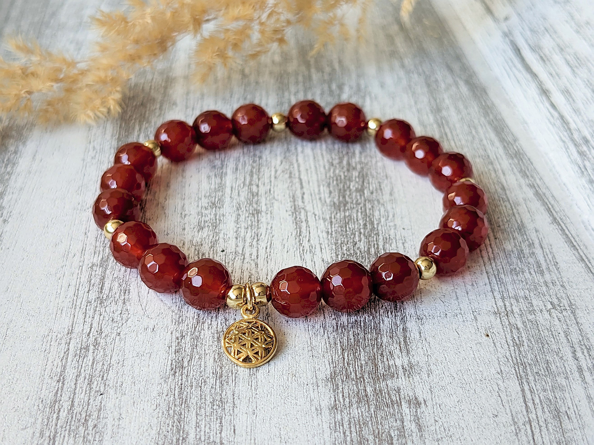 Náramok z karneolu je vytvorený z brúsených korálok veľkosti 8 mm a je doplnený o pozlátený prívesok a oceľové korálky. Je na elastickom lanku a sedí na obvod 15 cm. V prípade potreby je možné náramok upraviť, stačí v objednávke do poznámky uviesť obvod zápästia natesno.