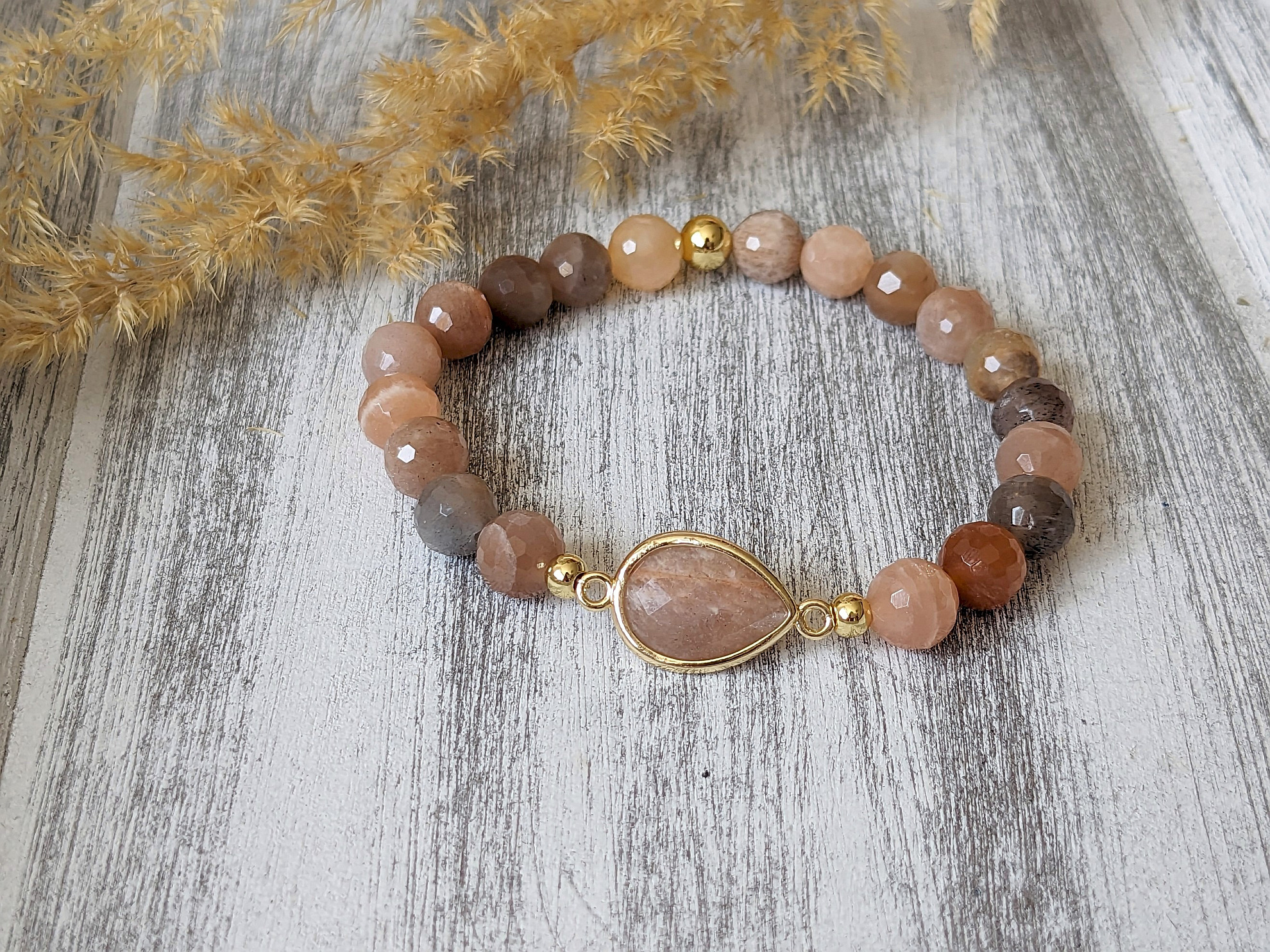 Náramok zo slnečného a mesačného kameňa tvoria 8 mm brúsené korálky slnečného a mesačného kameňa. Korálky dopĺňa komponent v tvare slzy zo slnečného kameňa. Náramok je na elastickom lanku a sedí na zápästie 15 cm. Veľkosť je možné upraviť, stačí v objednávke do poznámky uviesť obvod zápästia natesno.