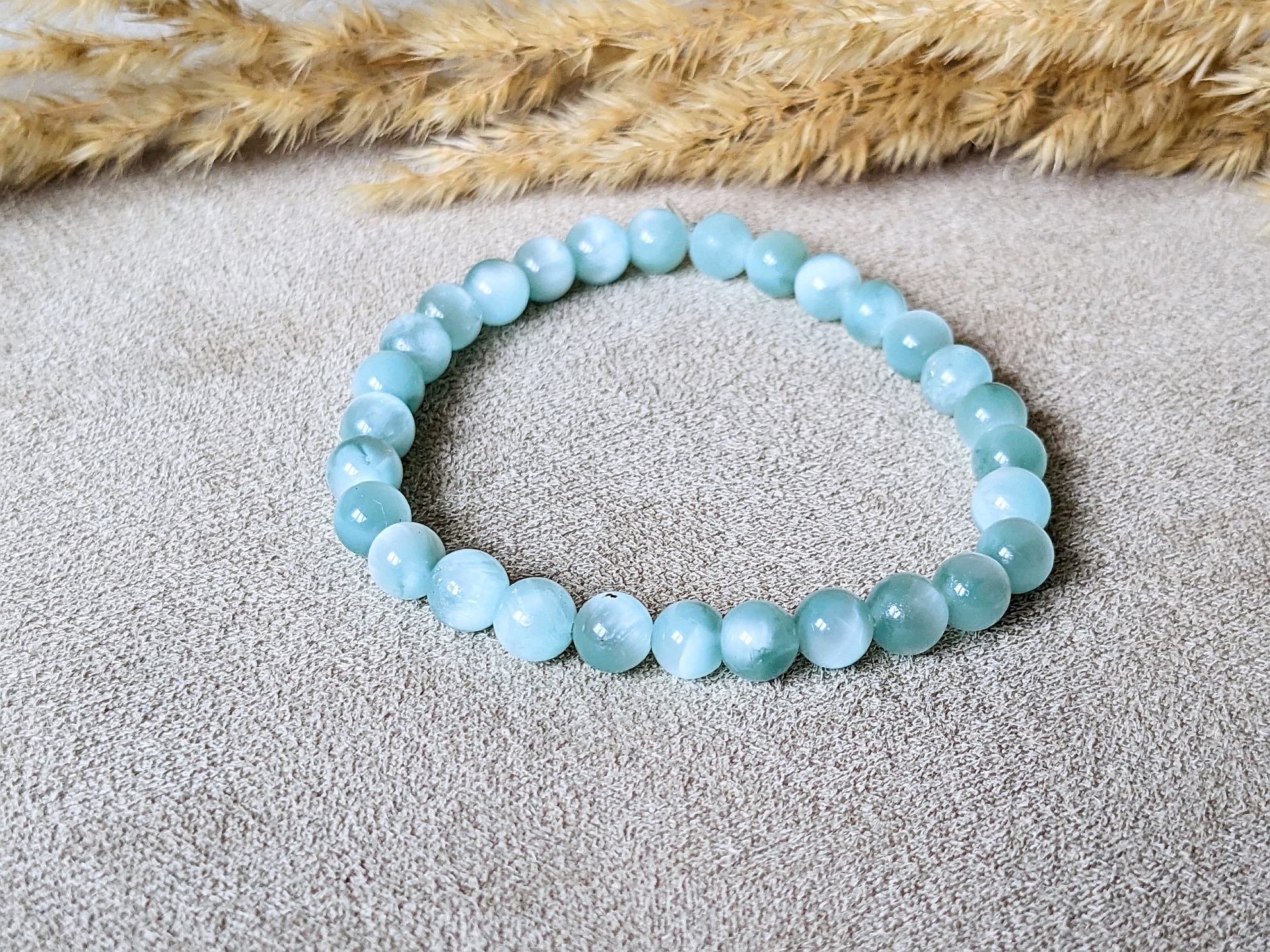 Náramok zo zeleného obsidiánu je krásny náramok v zaujímavej vodovo-modrej farbe. Korálky nie sú minerálom, ale je to prírodné, nedofarbované sklo. Veľkosť korálok je 5-6 mm. Náramok je na elastickom lanku. Sedí na zápästia 15 cm. V prípade potreby je možné veľkosť upraviť, stačí v objednávke uviesť do poznámky obvod zápästia natesno.