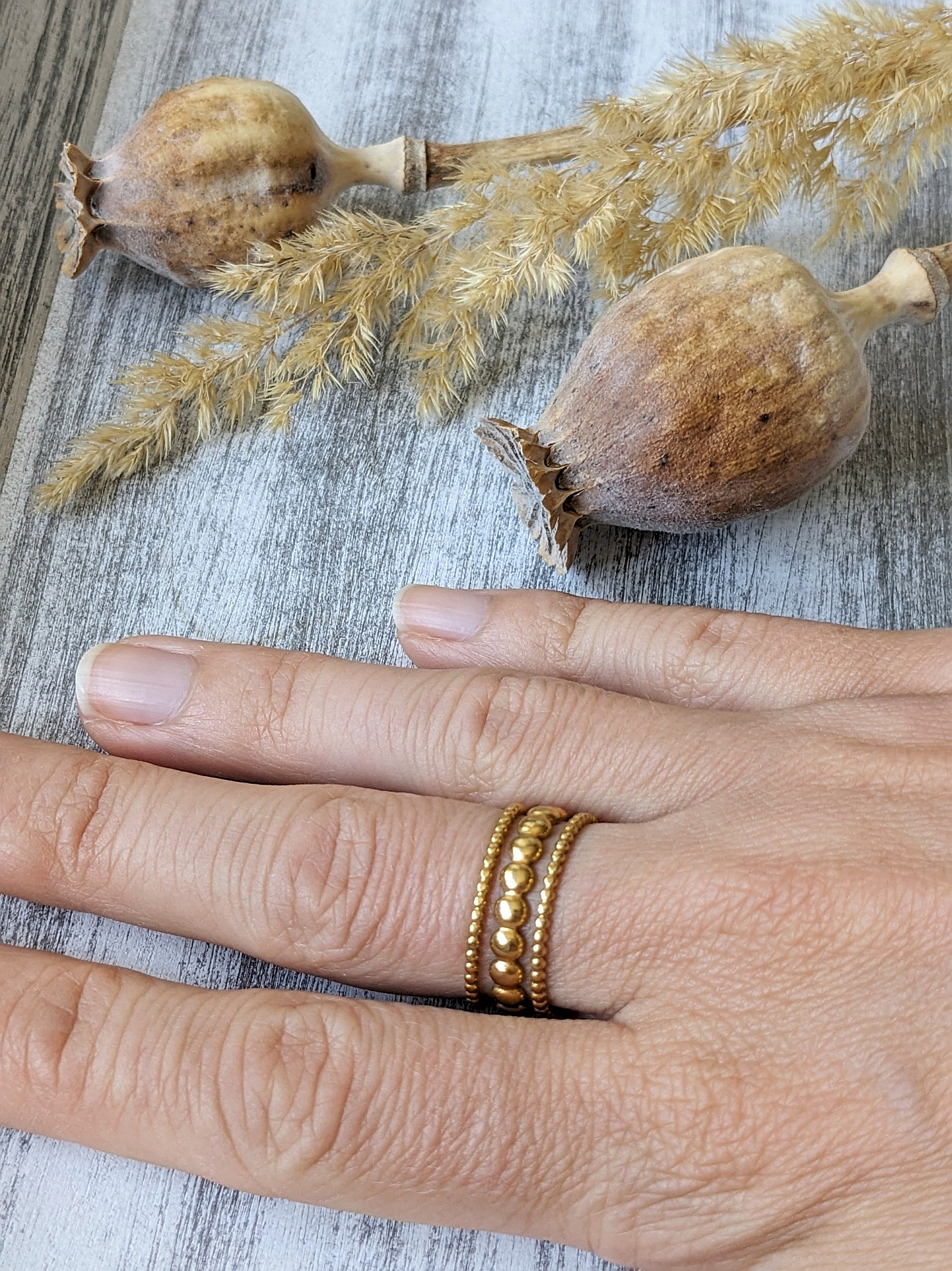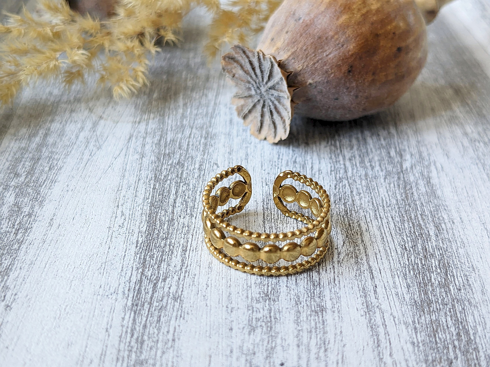 Prsteň zlatý oceľový je výrazný prsteň, ktorý krásne ukáže na ruke sám, ale aj v kombinácii s prstienkami z minerálov. Prsteň je vyrobený z nehrdzavejúcej ocele. Je pozlátený 18k zlatom. Špeciálne nanášané zlatenie má dlhú trvácnosť. Prsteň má veľkosť 52, avšak možno ho jemne upraviť.