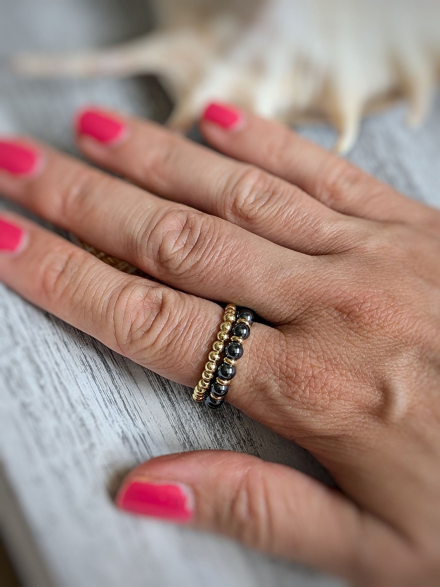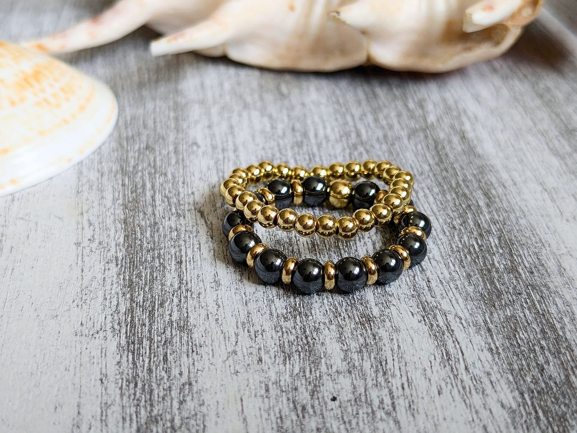 Prstene z hematitu a ocele tvoria pár, ktorý spolu krásne vynikne. Tmavá lesklá antracitová farba hematitu je oživená oceľovými korálkami v zlatej farbe. Druhý prsteň tvoria korálky z ocele v zlatej farbe. Prstene sú na elastickom lanku, je možné veľkosť upraviť na Vaše potreby. Pri objednávke mi prosím do poznámky uveďte veľkosť prsteňa, ktorú nosíte alebo si zmerajte vnútorný priemer nejakého prsteňa, ktorý nosíte (prípadne ešte zmerajte obvod prstu, kde chcete nosiť prsteň, natesno).