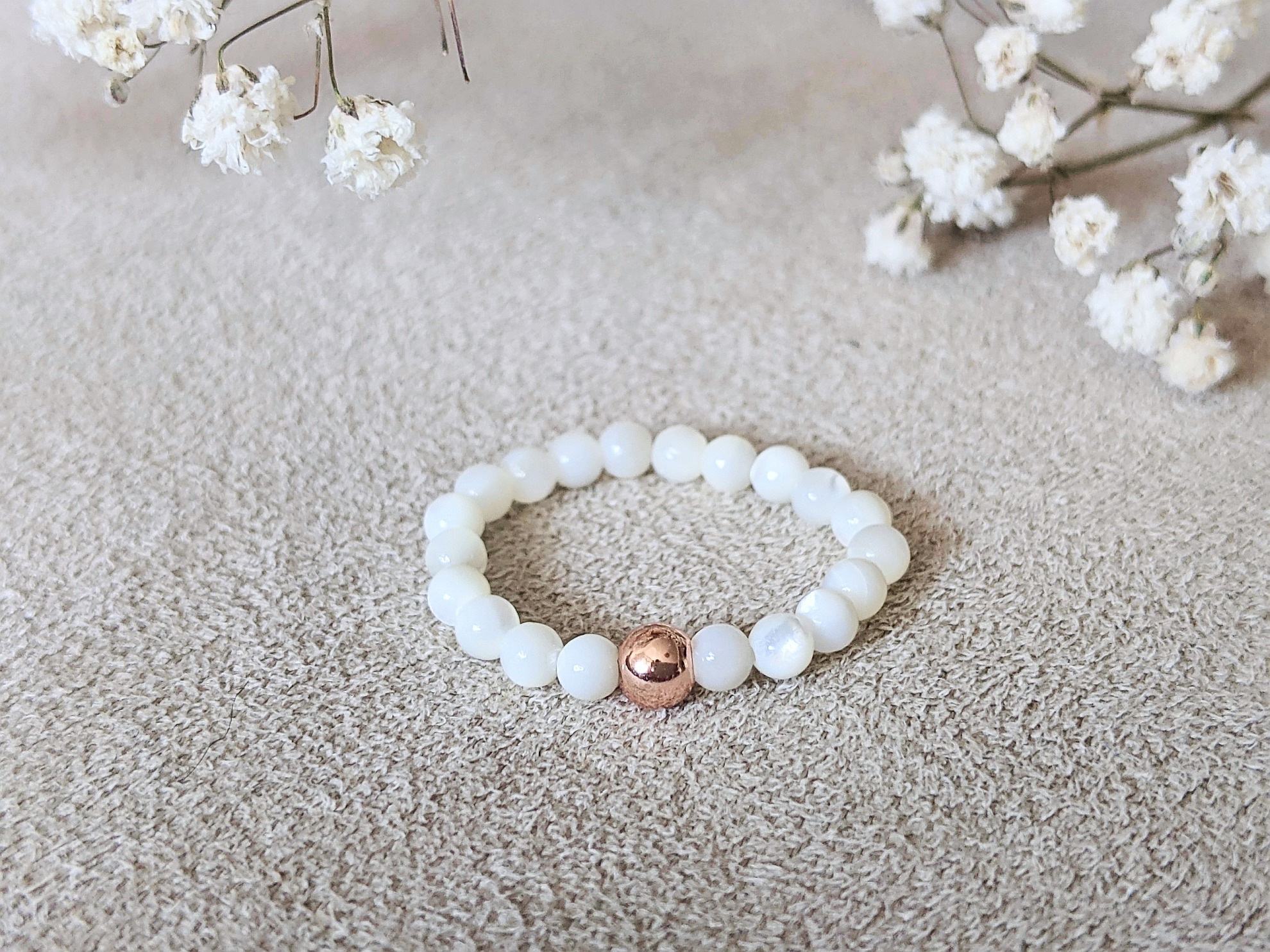 Prstienok z perlete a ružového zlata nádherne vynikne na opálenej ruke. Korálky sú veľkosti 3 mm, prstienok je doplnený o korálku z ocele vo farbe ružového zlata. Ak zatúžite po čisto perleťovom prstienku na ruke, stačí korálku otočiť smerom k dlani. Prstienok je vyrobený na veľkosť prsteňa 53. Prstienok je na elastickom lanku. Ak potrebujete veľkosť upraviť, stačí do poznámky pri objednávke uviesť veľkosť prstienka, ak neviete veľkosť prsteňa, stačí odmerať vnútorný priemer prsteňa, ktorý máte doma alebo zmerať obvod prsta natesno). Krásne ukáže aj viac prstienkov na ruke, nielen jeden.