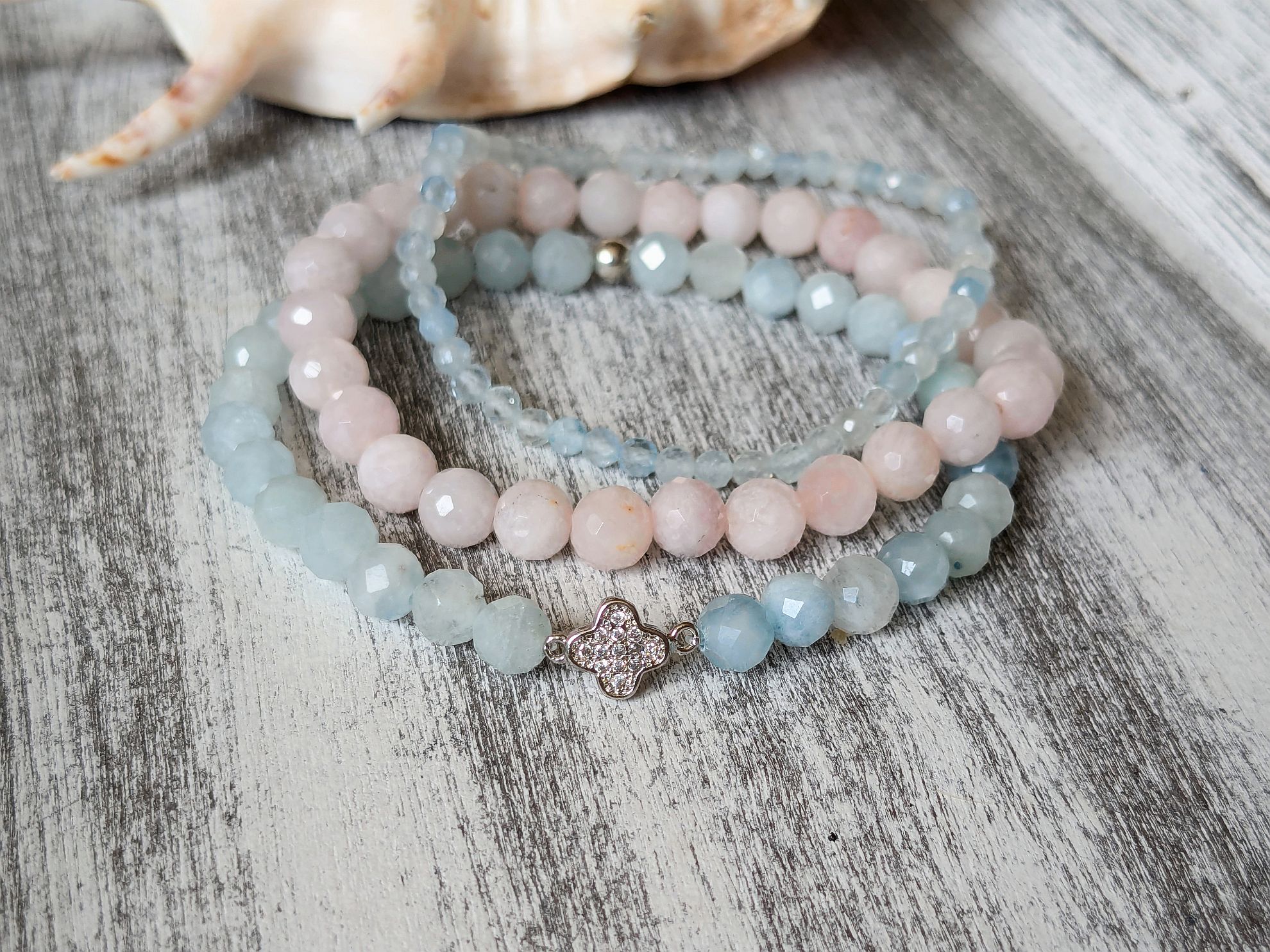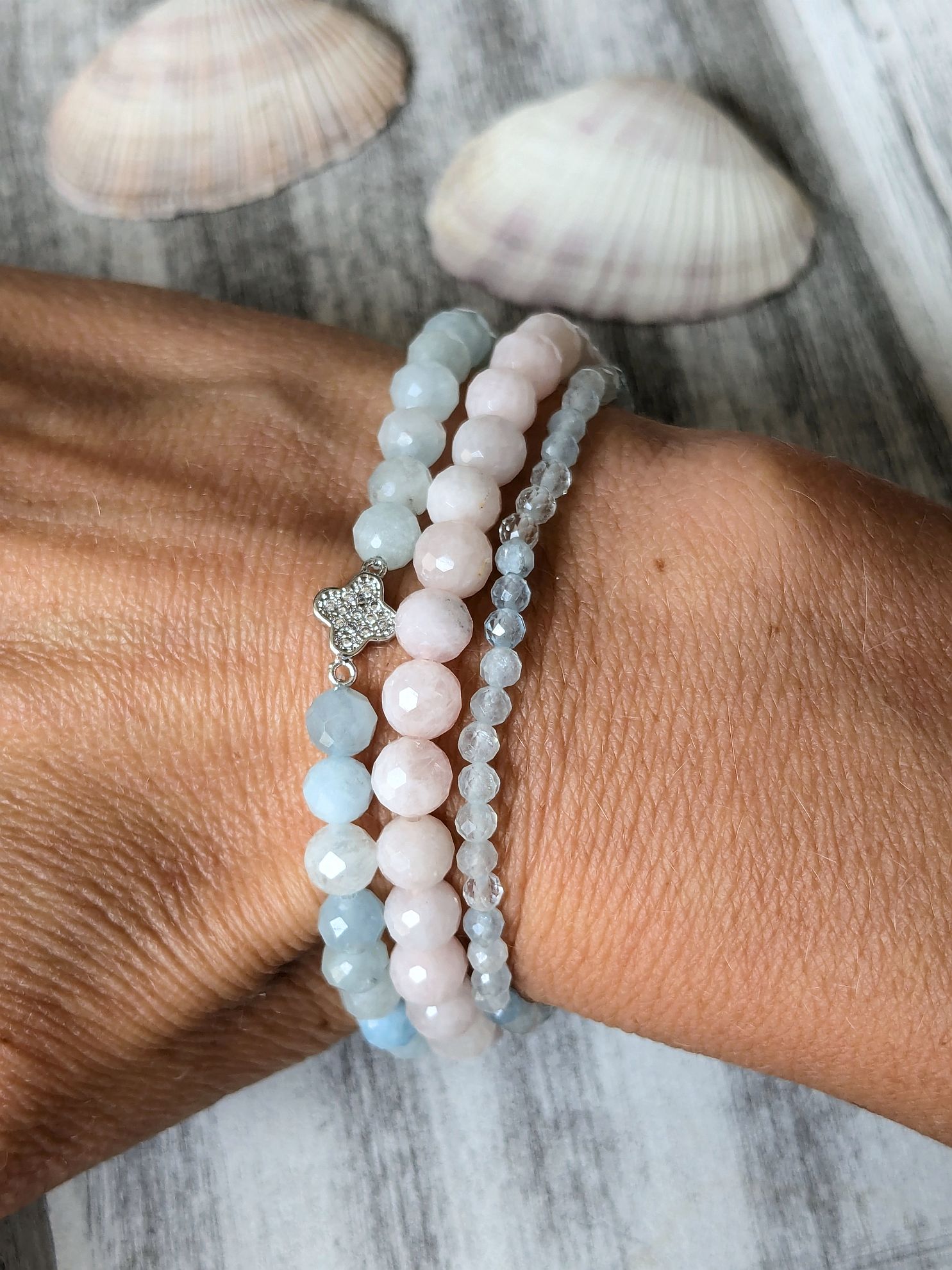 Set akvamarín a ruženín tvoria tri náramky v jemný pastelových farbách: