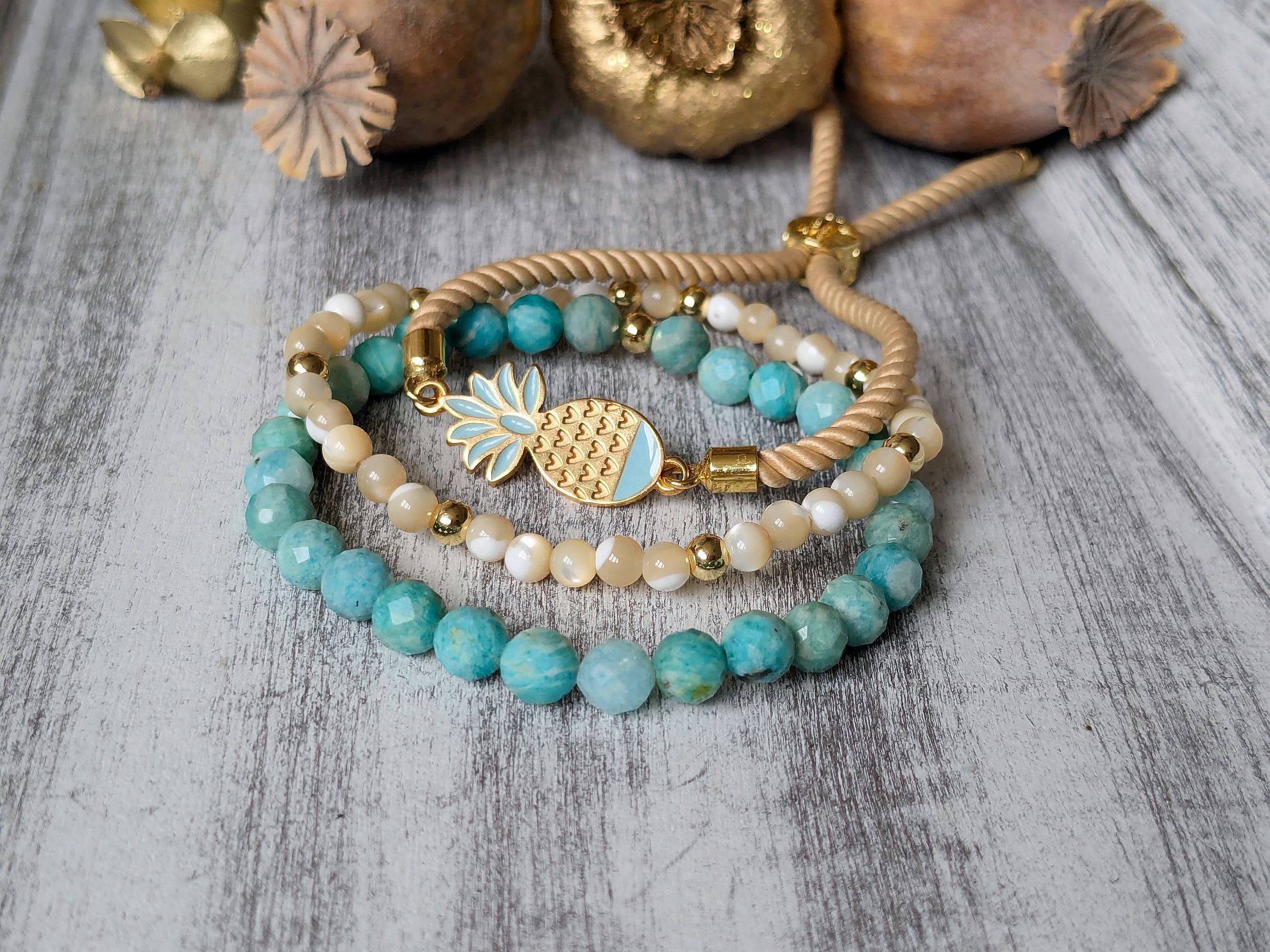 Set amazonit a perleť je set v krásnych farbách s letným motívom. Pozostáva z troch náramkov: