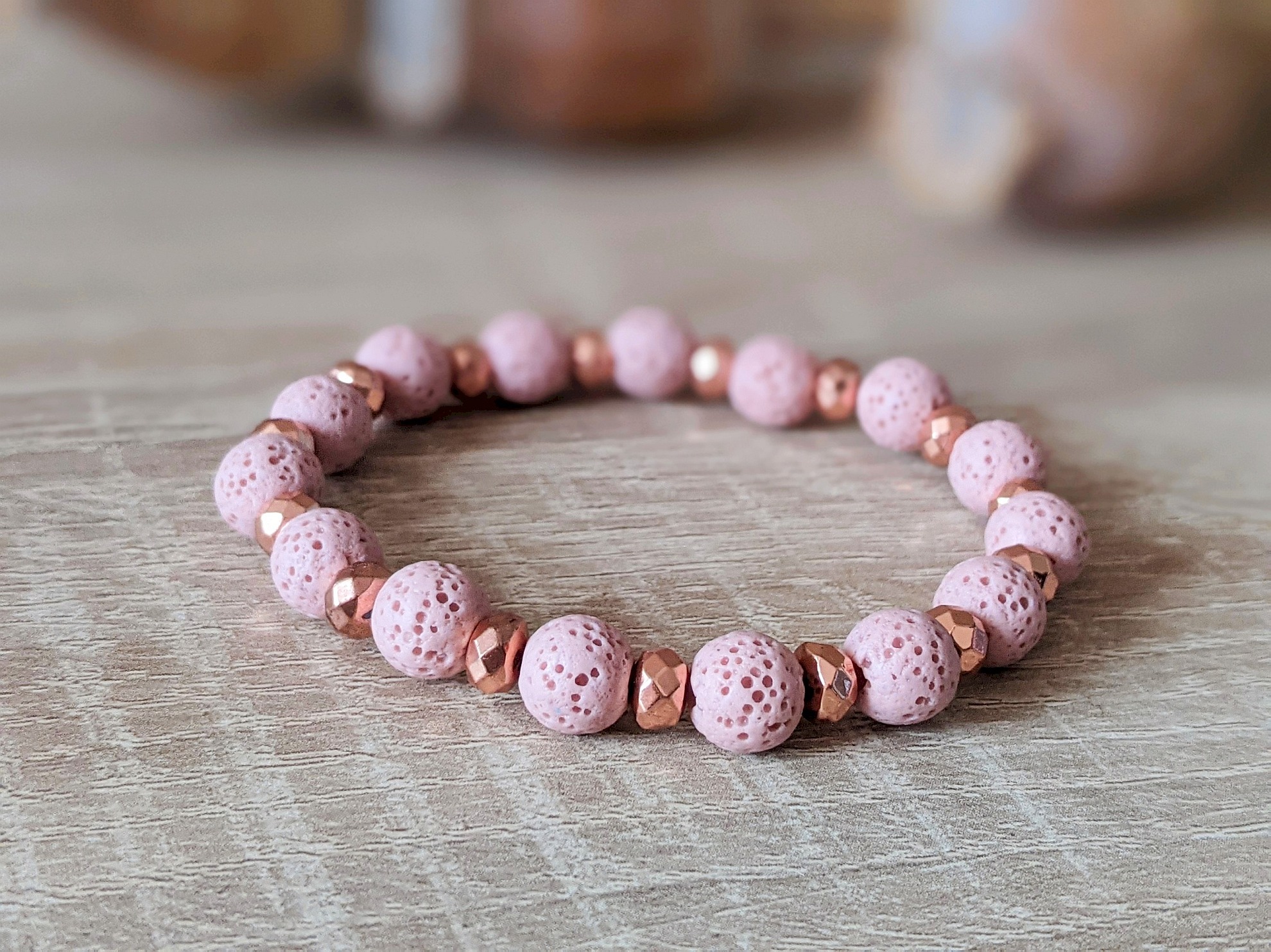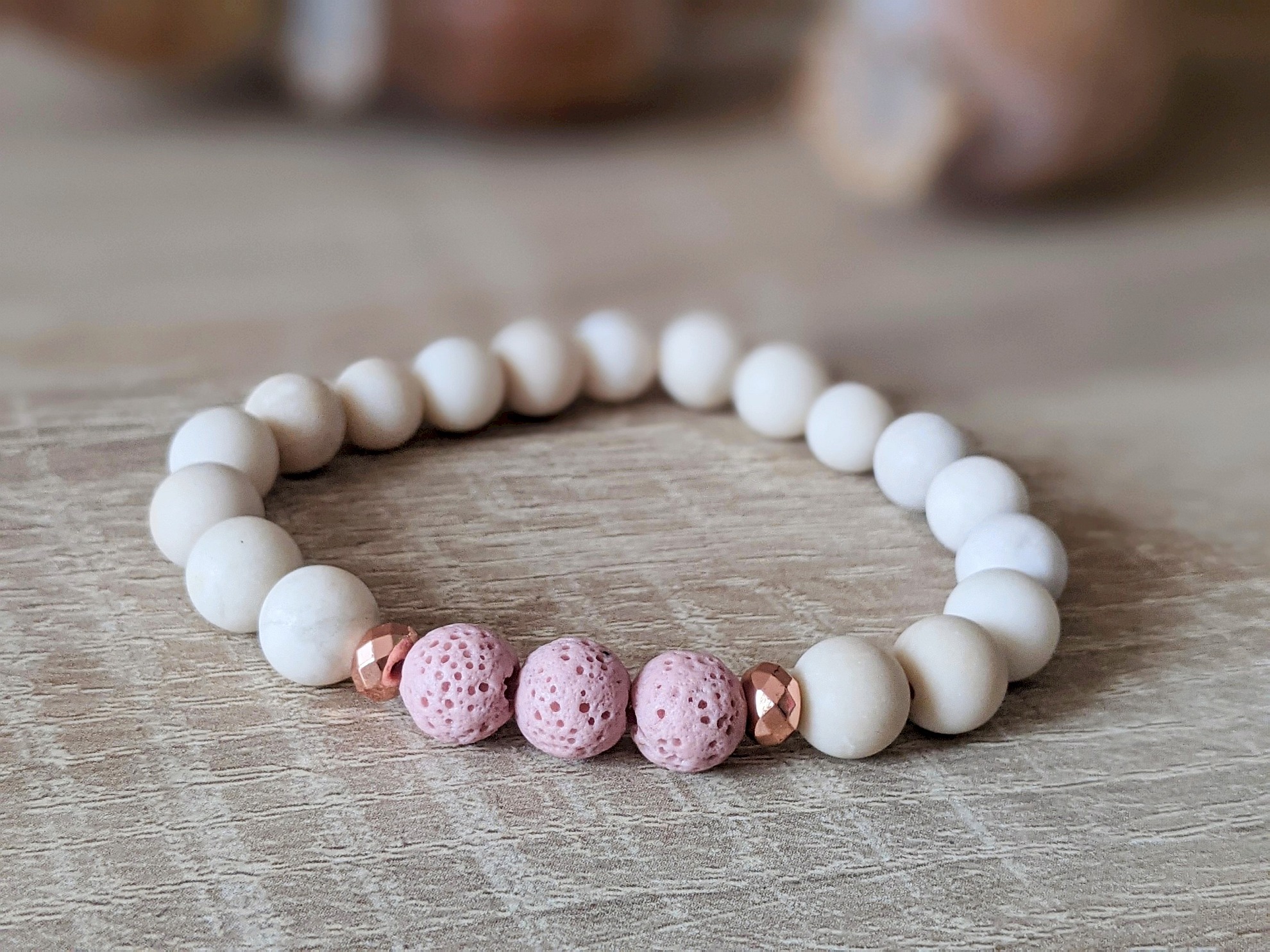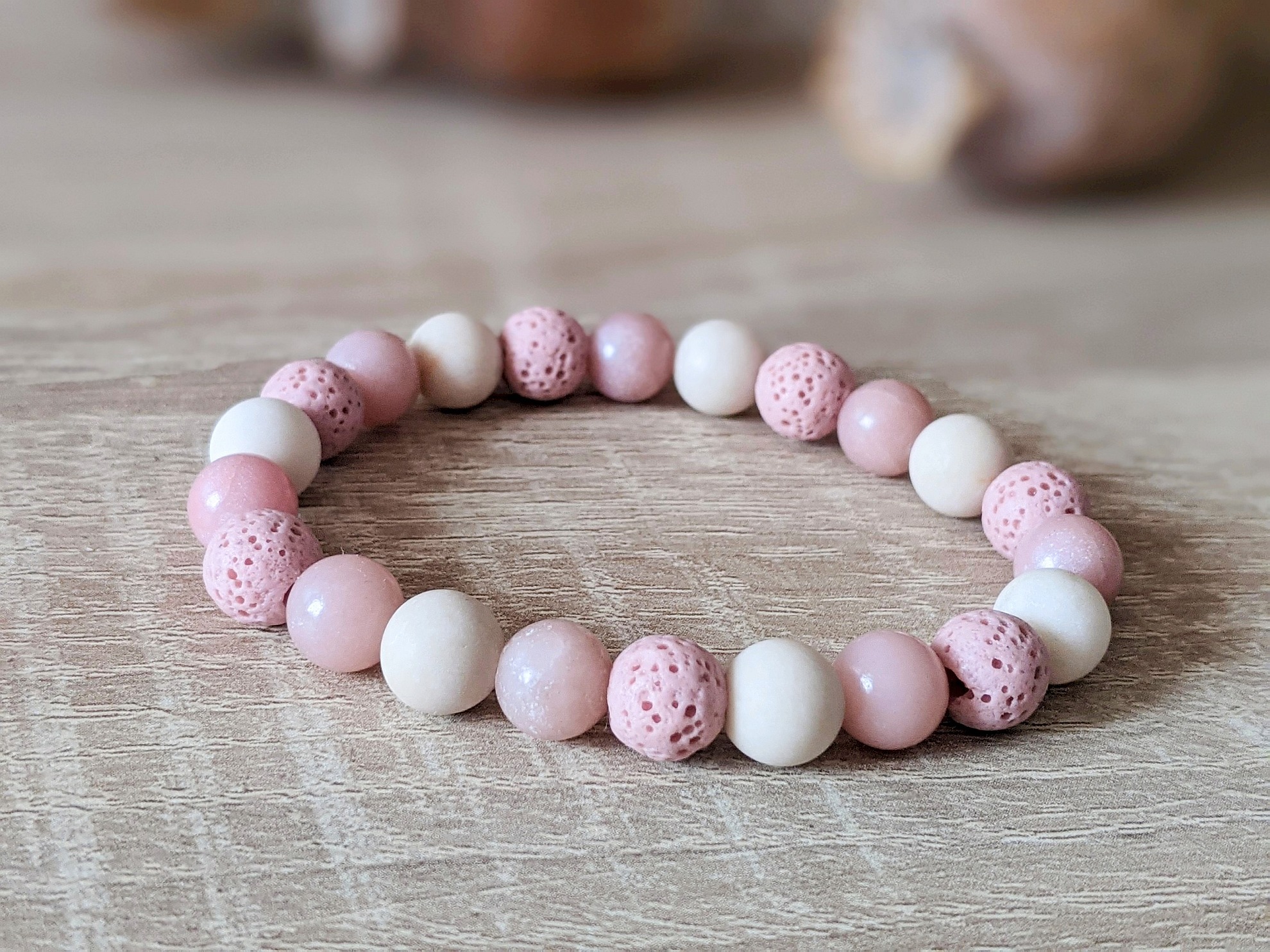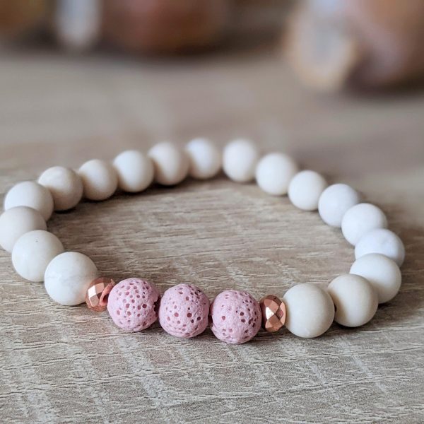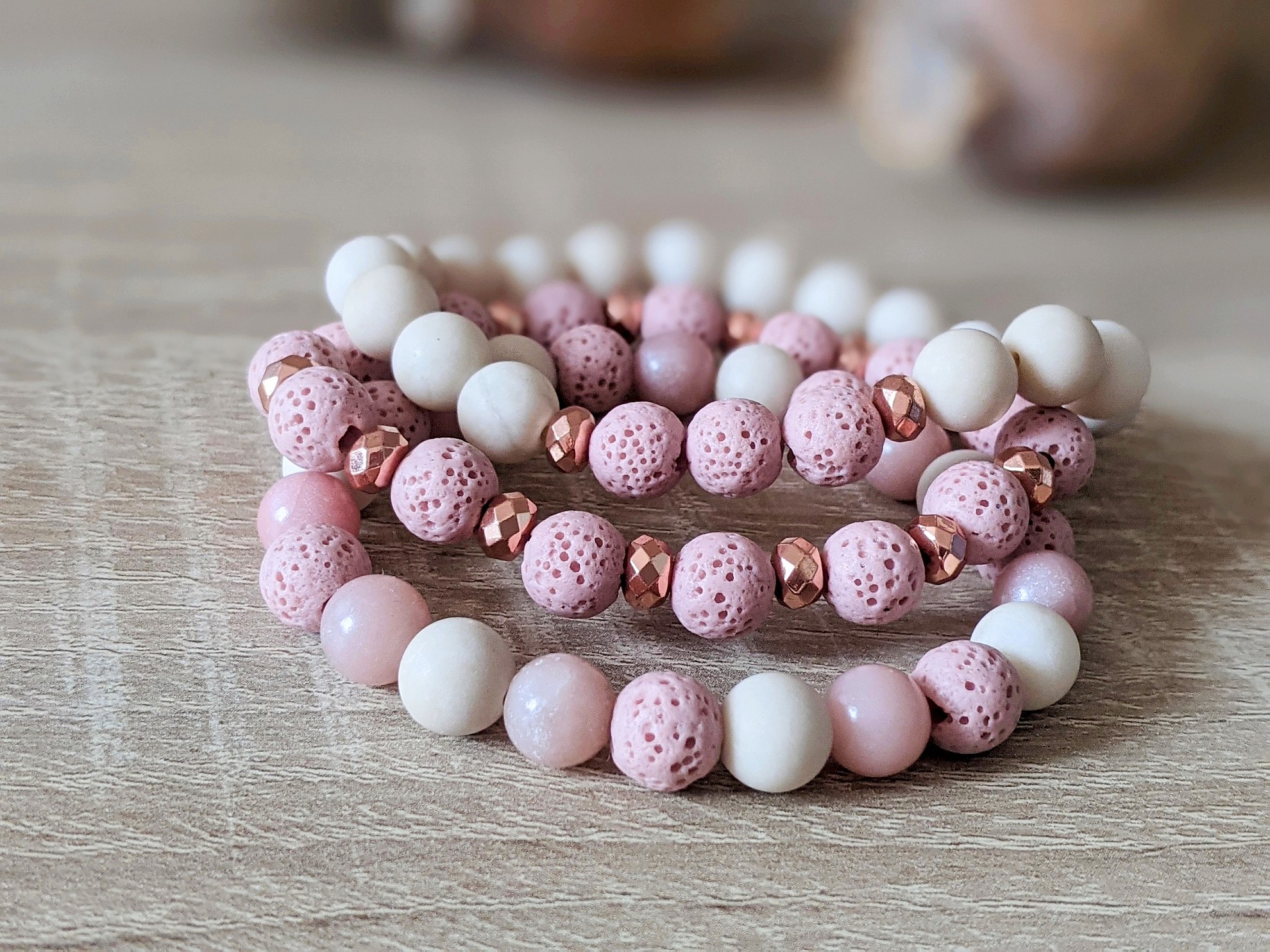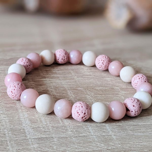 Set náramkov z lávy, fosílie a opálu je šperkom pre všetky ženy, ktoré milujú pastelové jemné farby. Púdrová ružová a béžová sú moderné farby, ktoré nádherne oživia Váš outfit. Použité minerály: ružová láva (8 mm), matná fosília (8 mm), ružový opál (8 mm) a syntetický hematit vo farbe ružového zlata. Náramky sú na elastickom lanku. Vyrobené sú na obvod zápästia 15 cm. Možno upraviť dĺžku náramkov, stačí v objednávke uviesť do poznámky obvod zápästia natesno.