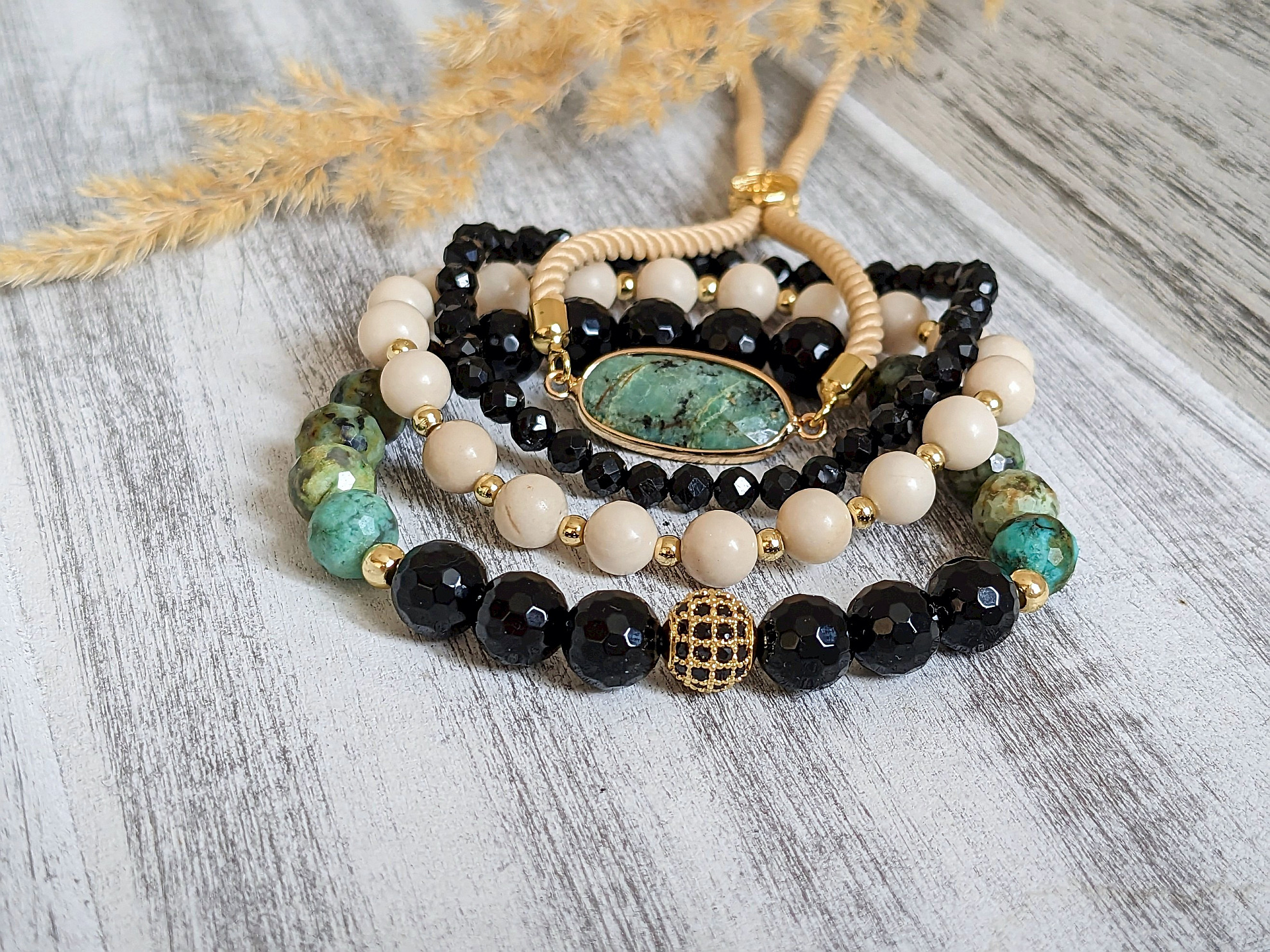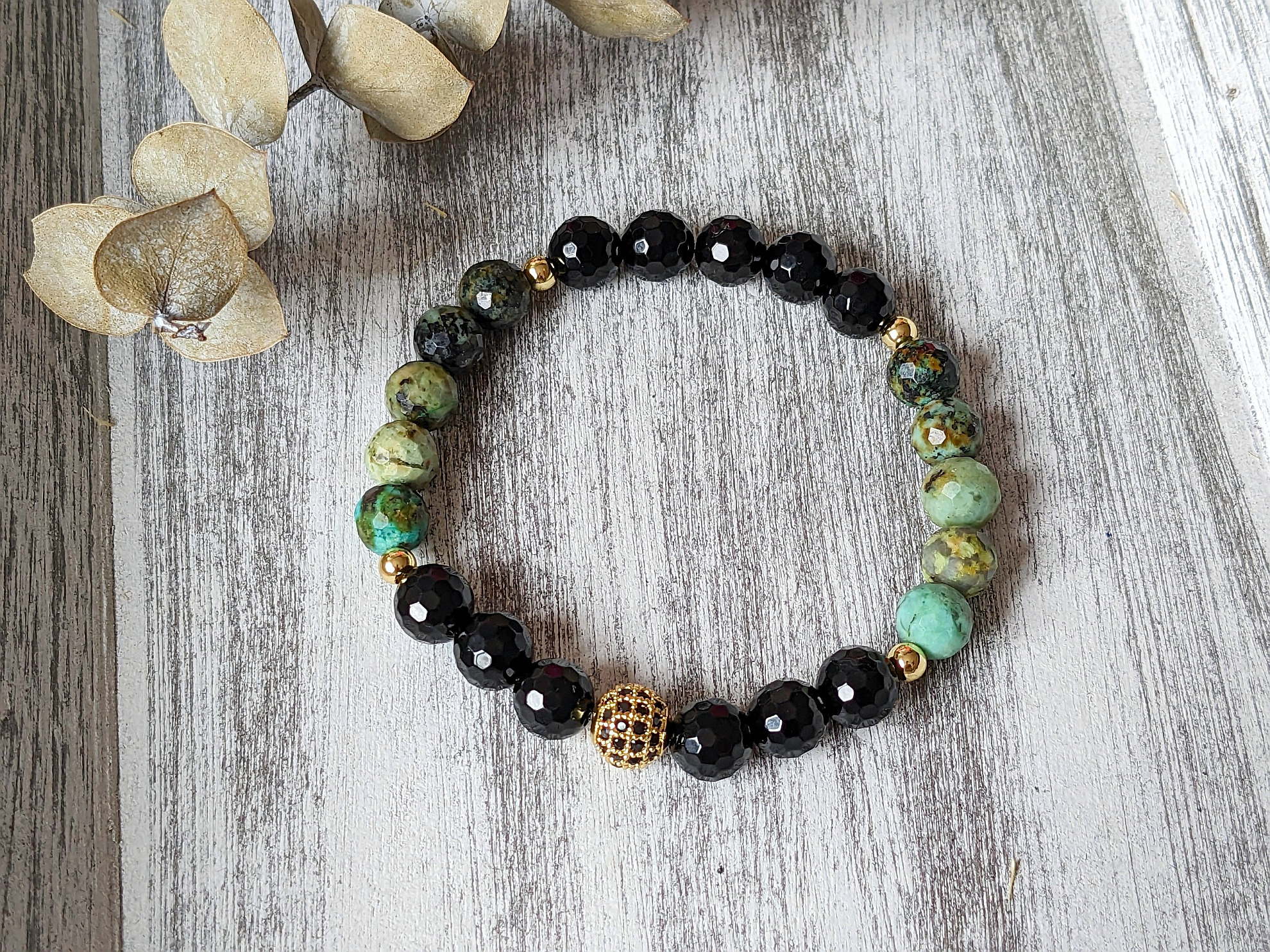 - náramok ónyx, africký tyrkys – je elegantný náramok, v ktorom sú minerály doplnené o komponenty v zlatej farbe, náramok je na elastickom lanku
