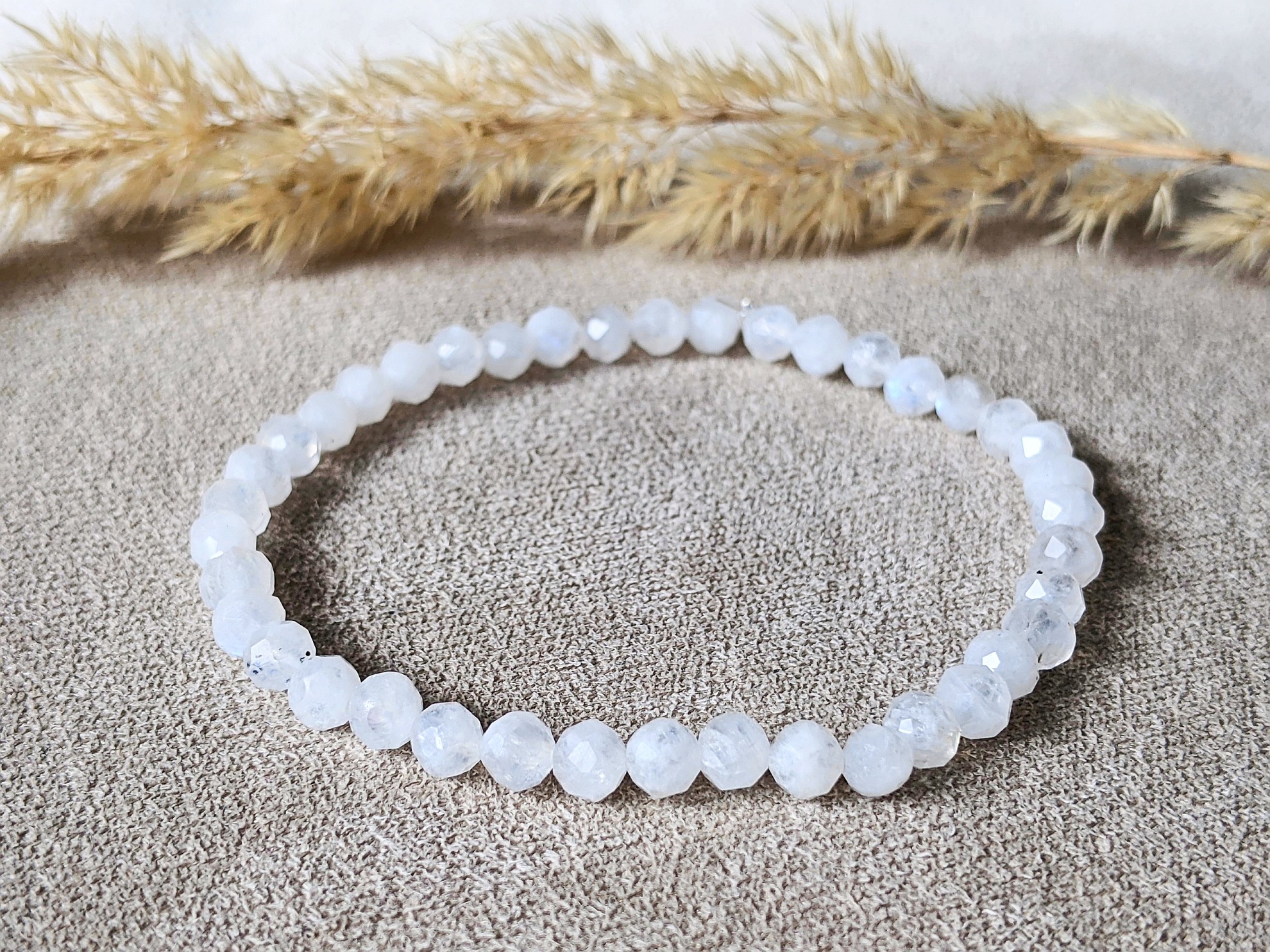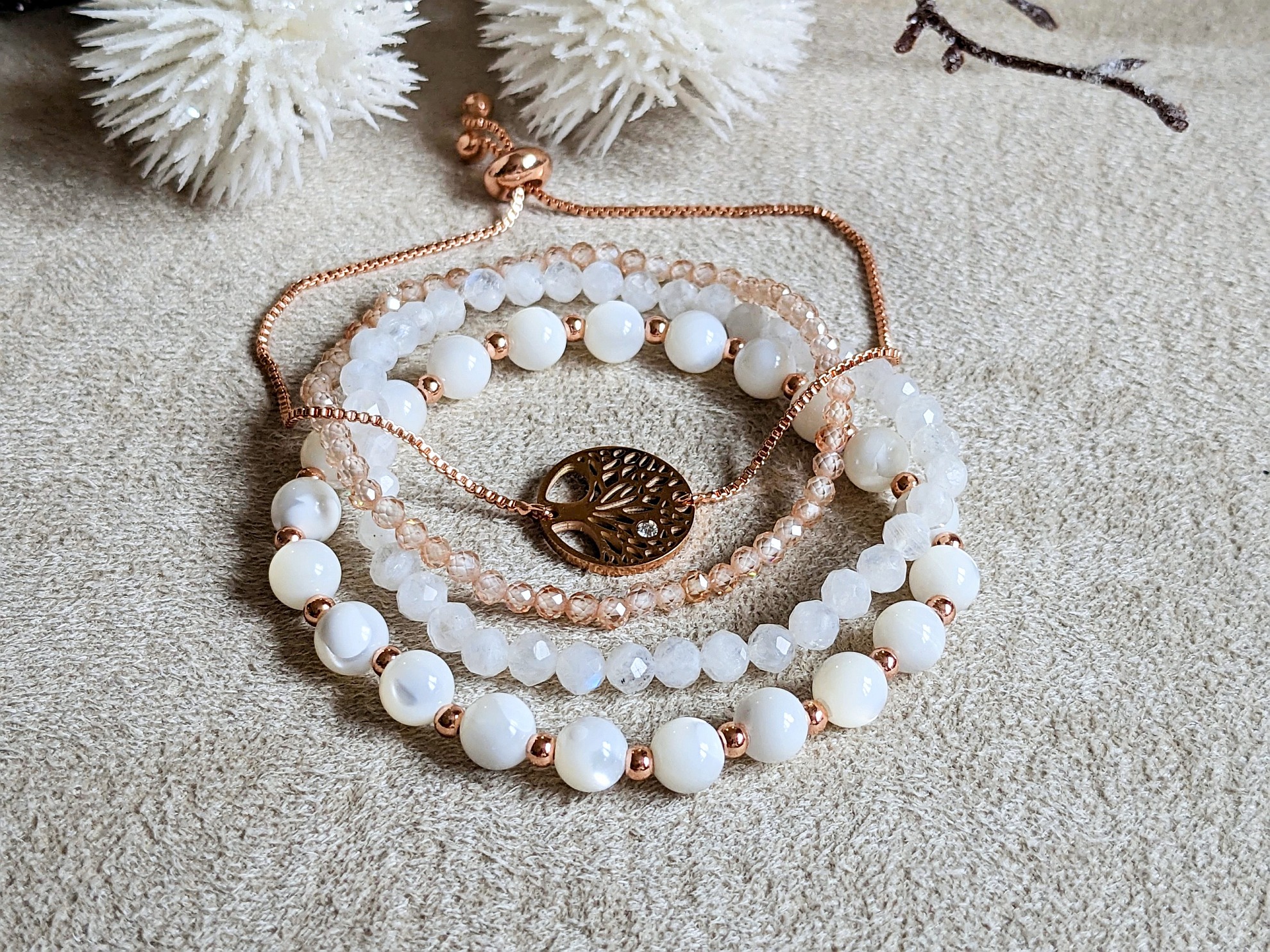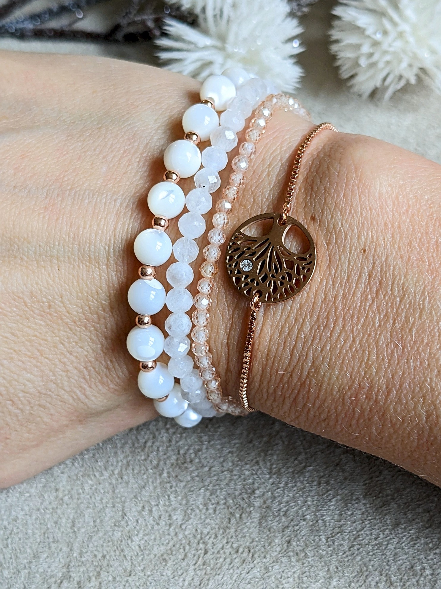 Set s perleťou a mesačným kameňom je jemný set tvorený zo 4 náramkov: náramku z perlete a oceľových korálok vo farbe ružového zlata, náramku z bieleho mesačného kameňa, náramku z kubického zirkónu a retiazkového náramku. Retiazkový náramok so stromom života je z bežného kovu vo farbe ružového zlata. Je nastaviteľný, maximálny obvod zápästia je 22 cm. Ostatné náramky sú na elastickom lanku, vyrobené na obvod zápästia 15 cm. Je možné veľkosť zmeniť, stačí do poznámky v objednávke uviesť obvod zápästia natesno.