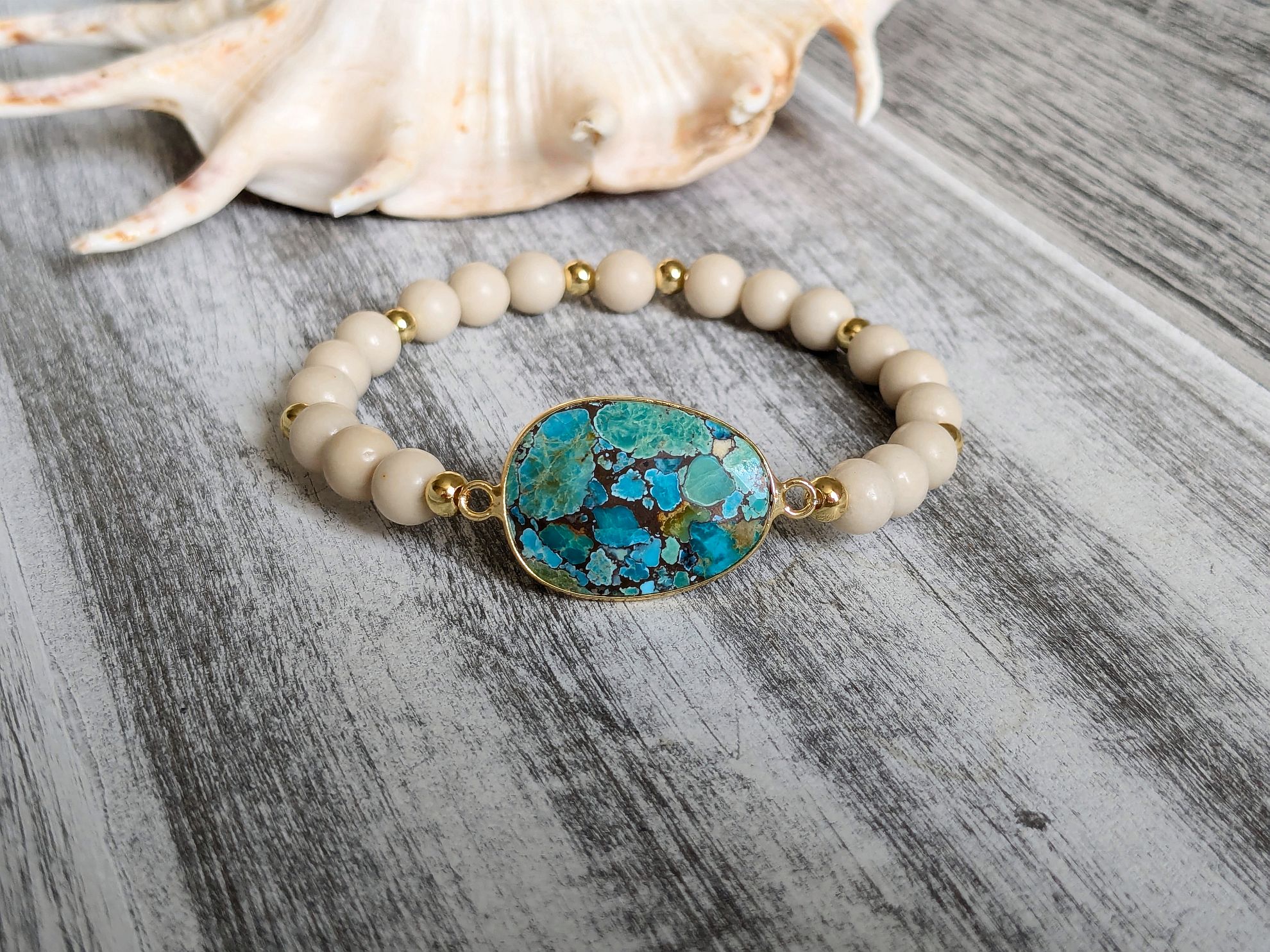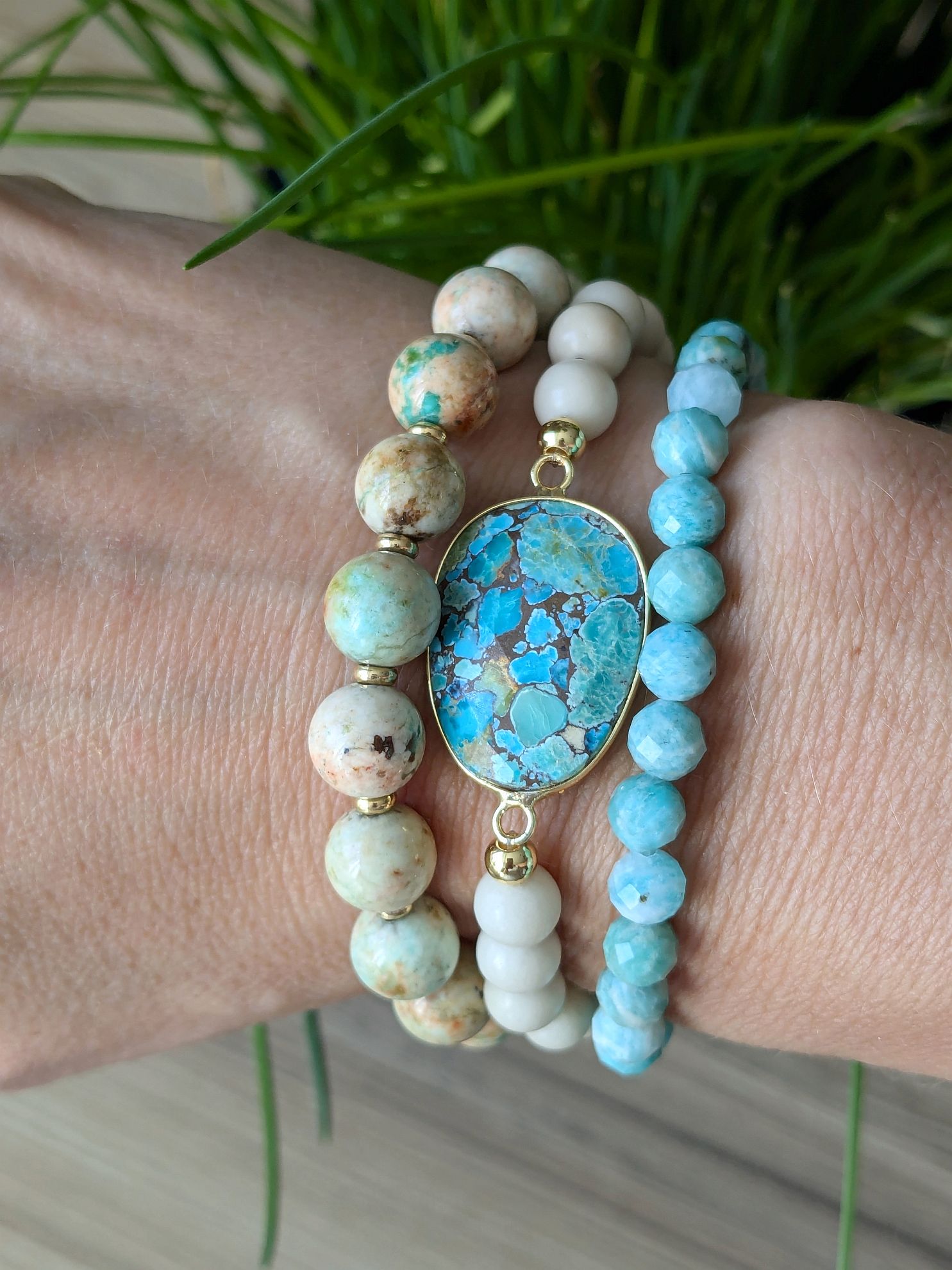 Set tyrkys, fosília a amazonit pozostáva z troch náramkov v prírodných farbách: