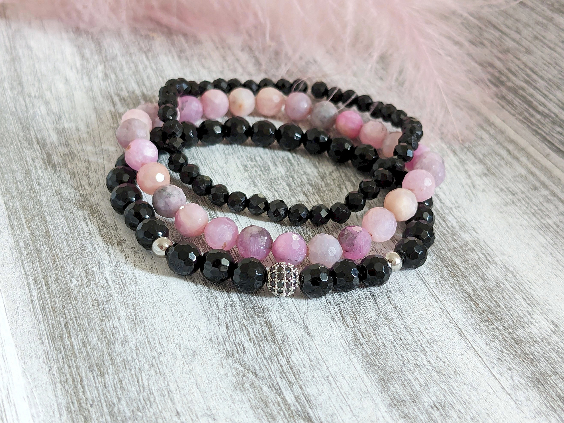 Set z ónyxu a turmalínu tvoria tri náramky v čierno-ružovej kombinácii: