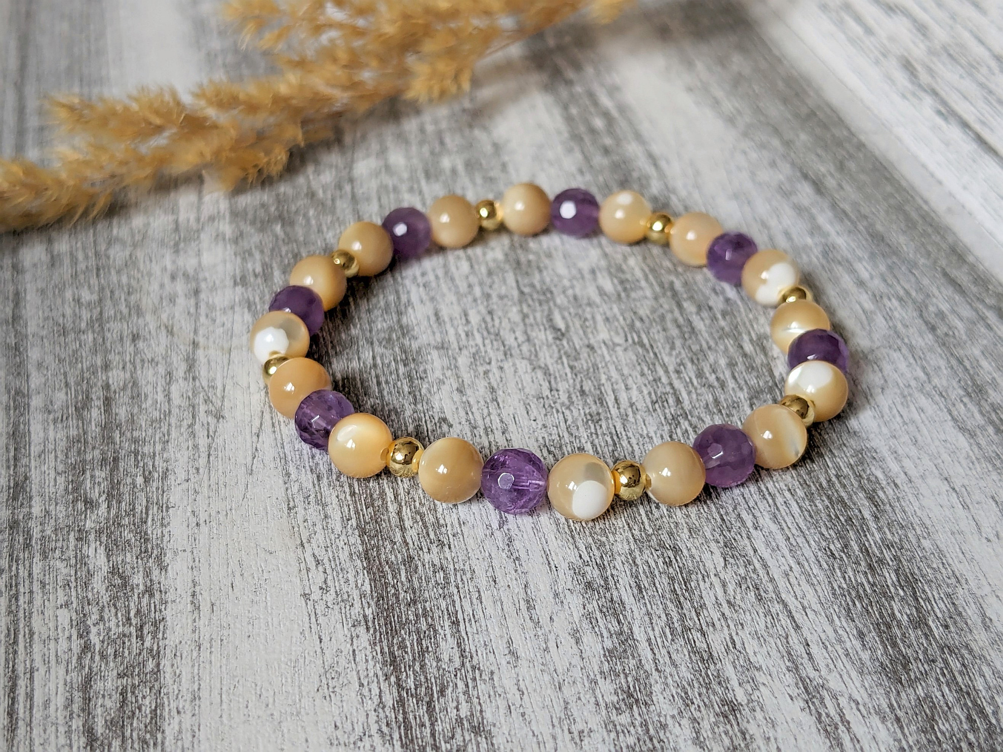 • náramku z perlete a ametystu – náramok je kombináciou perleťových a ametystových korálok veľkosti 6mm, ktoré sú doplnené o zlaté oceľové korálky