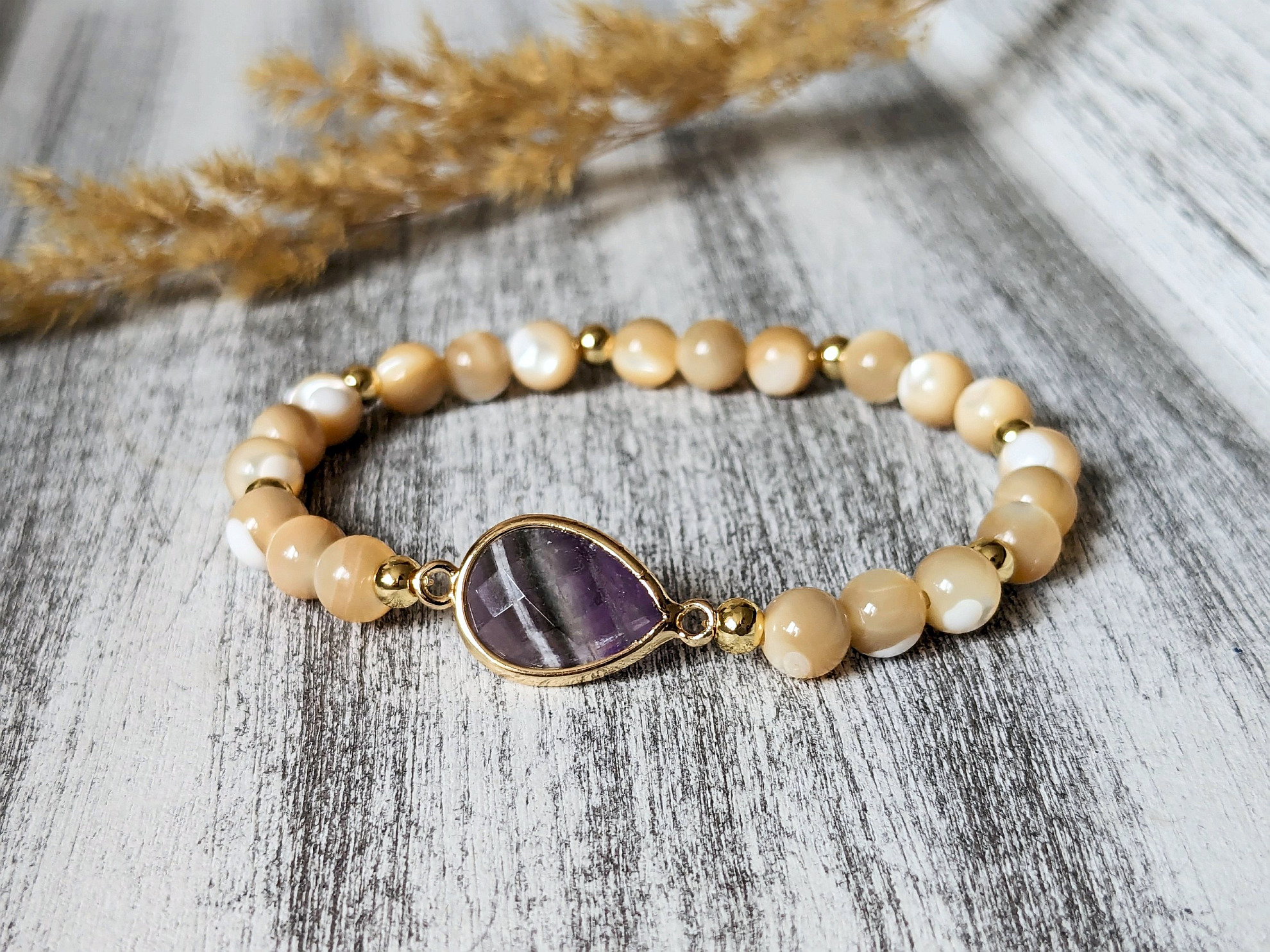 • perleťového náramku s ametystom – náramok je z 6mm korálok béžovej perlete, doplnený je o komponent z ametystu a korálky zo zlatej ocele