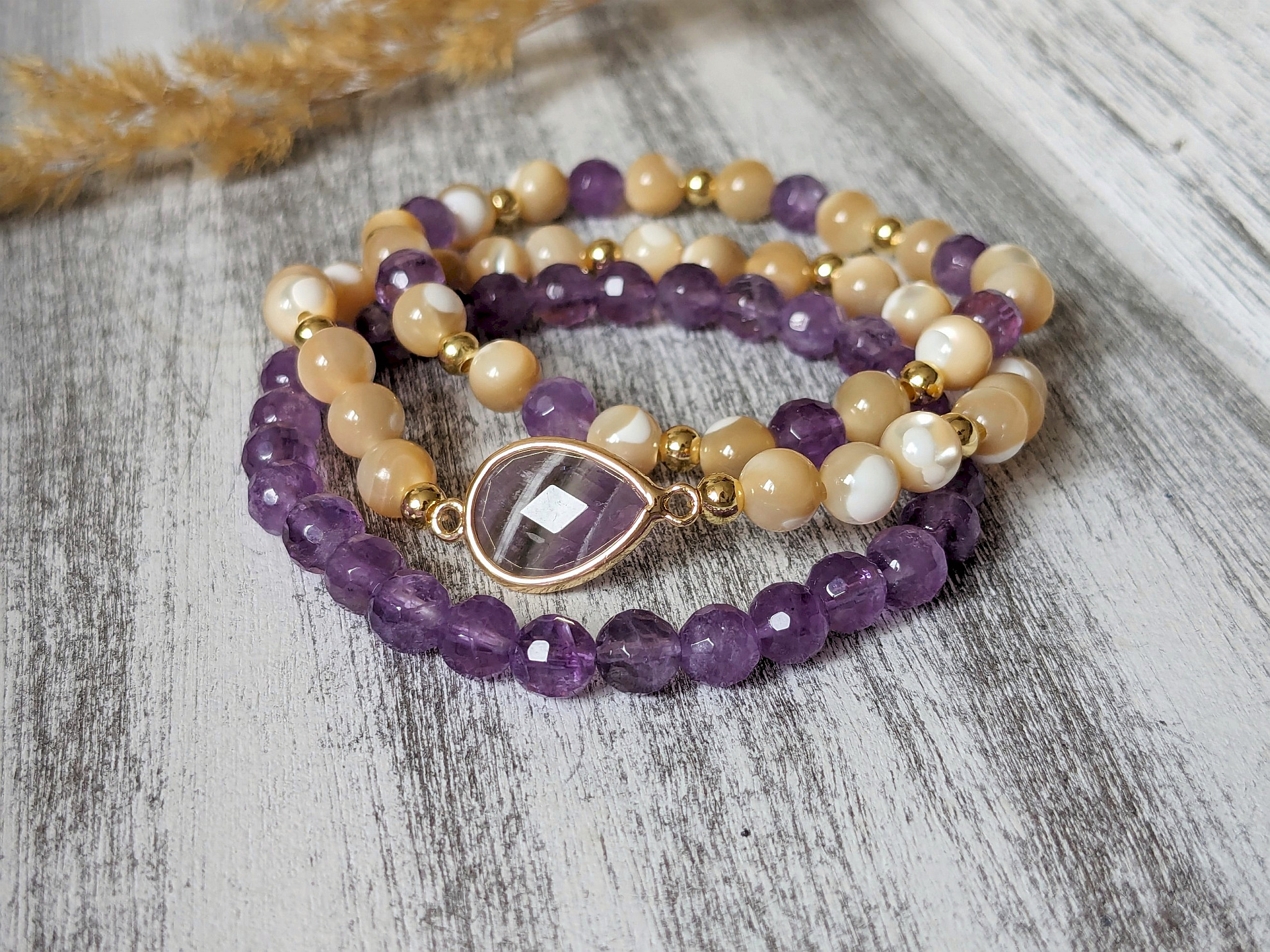 Set z perlete a ametystu je elegantný set v krásnej fialovo-béžovo-zlatej kombinácii z minerálov perleť a ametyst. Set pozostáva z troch náramkov: