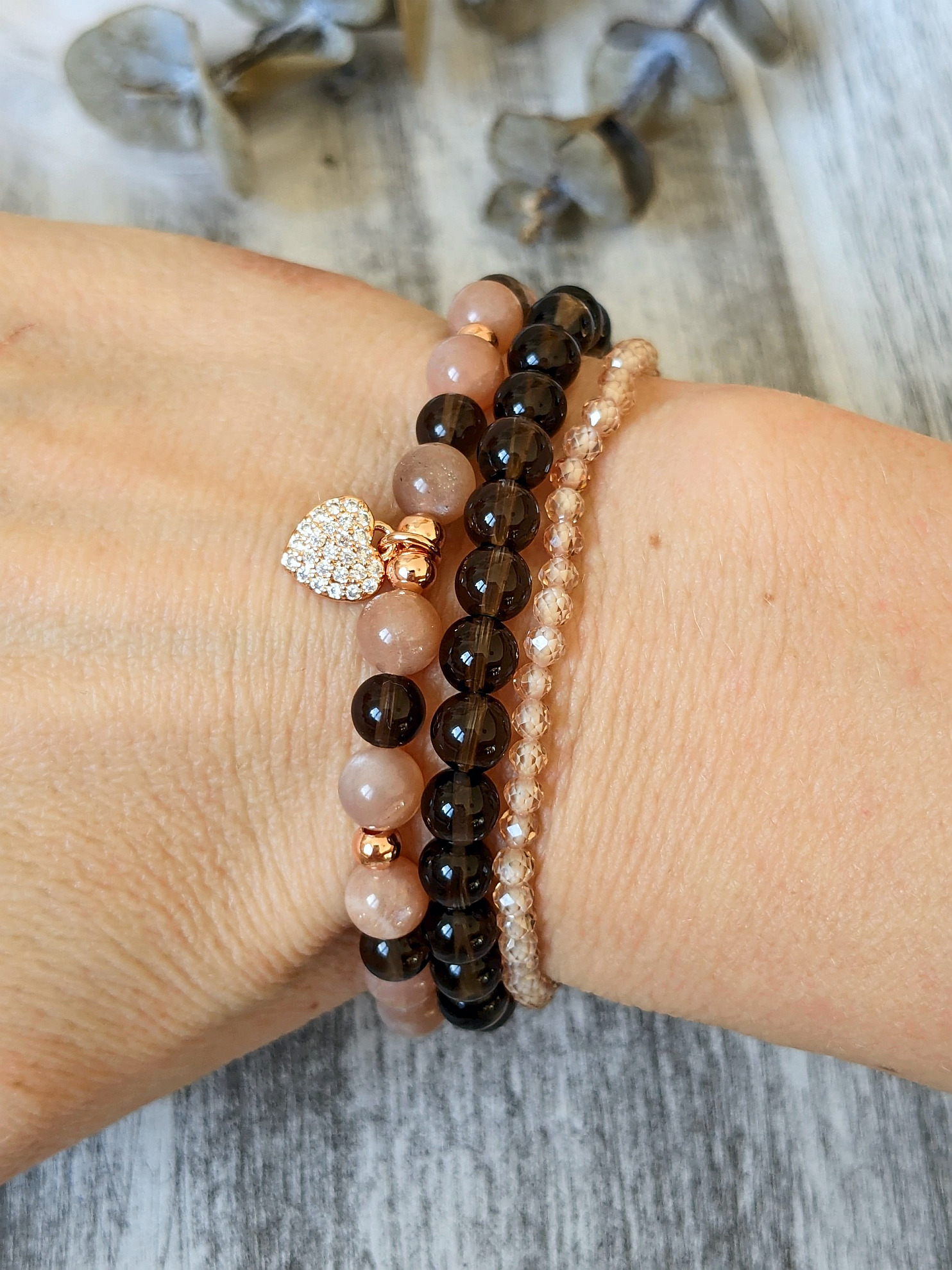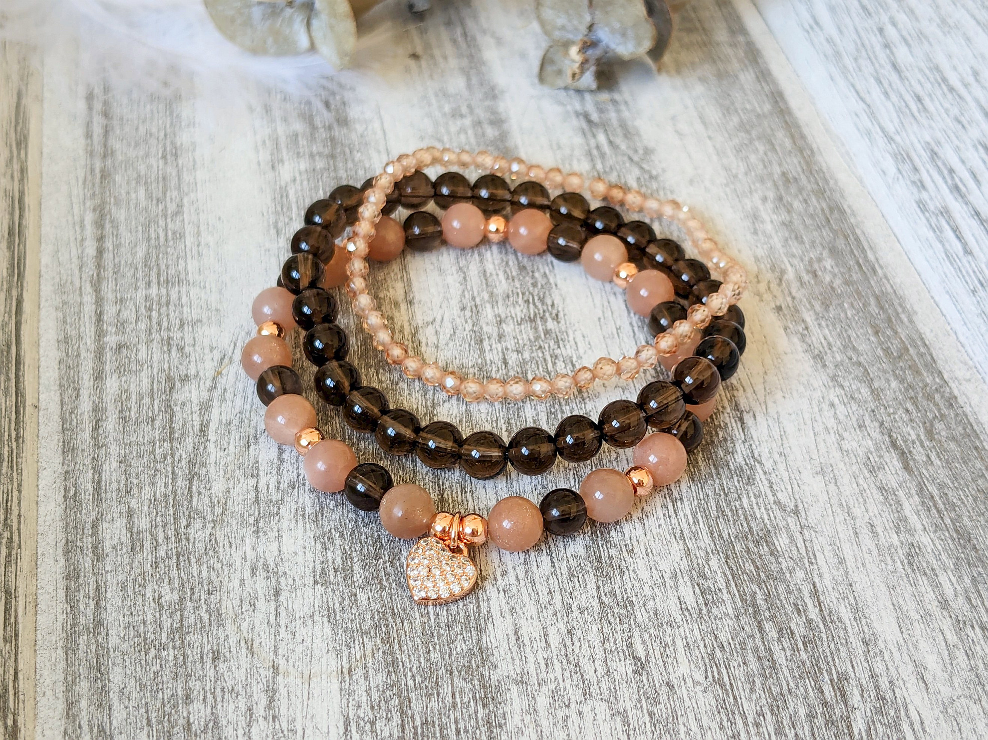 - náramok zo záhnedy a slnečného kameňa – slnečný kameň a záhnedu dopĺňajú oceľové korálky vo farbe ružového zlata a zirkónové srdiečko