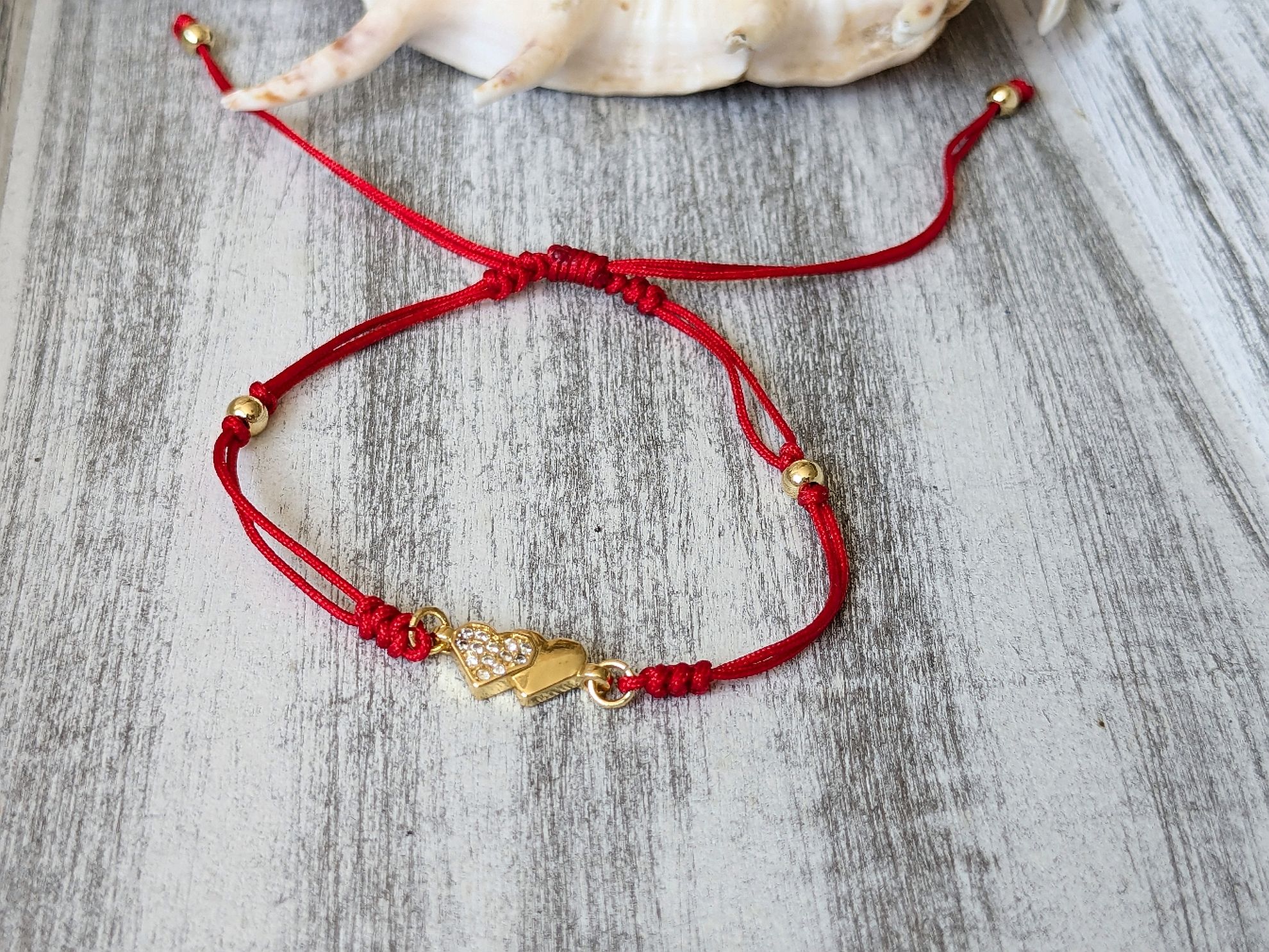 Šnúrkový náramok červený je jemný moderný náramok, ktorého hlavným prvkov sú dve spojené srdiečka. Náramok je nastaviteľný, odporúčam ho však na zápästia s obvodom 16 cm a viac (kvôli obmedzeniu, do ktorého sa dá zatiahnuť šnúrka).